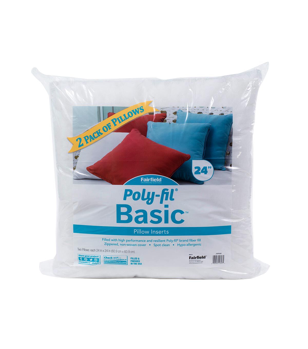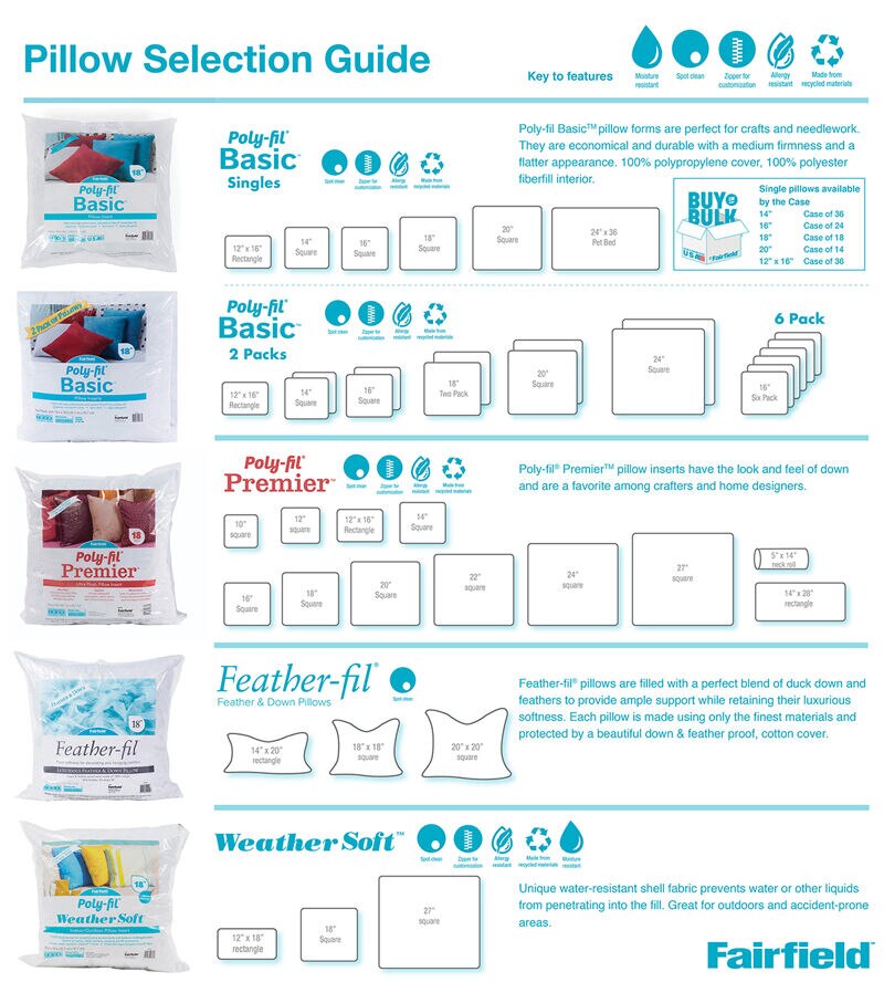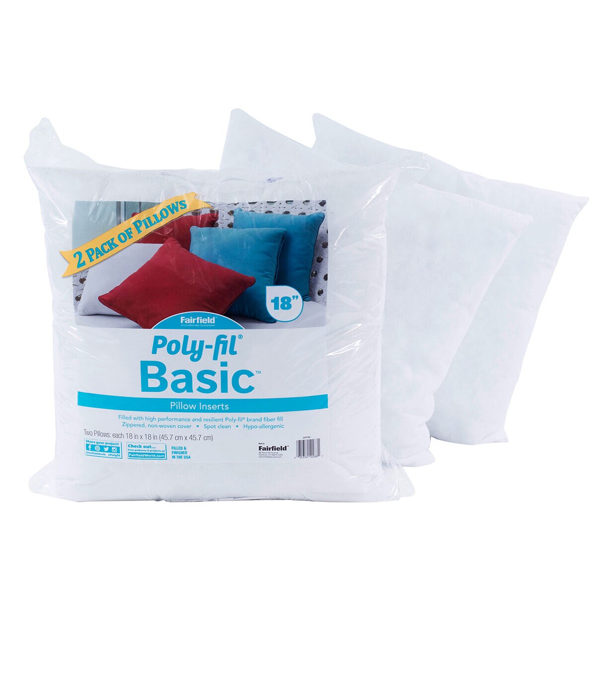 Poly-Fil Basic two pack pillow inserts are perfect when you want to do some DIY or craft projects with your friends or family. They also make a great creative activity at school or camp. Personalize them with fabric, faux fur, needlepoint, or a monogram, to add a special touch to your favorite spaces or give as gifts for those close to your heart. They are a quick, easy, and an inexpensive way to change and refresh the look of a room in your house or use as holiday and seasonal décor. The firm texture allows them to retain their shape when working with the heavier upholstery fabrics or heirloom pieces. Poly-Fil Basic pillow forms are made of 100% polyester fibers with no added chemicals or flame retardants and have a non-woven polypropylene cover. Add a splash of color to your décor, use them as accent pillows on sofas, love seats, or on your bed. For the perfect fit, your pillow cover should be an inch shorter than the pillow size.