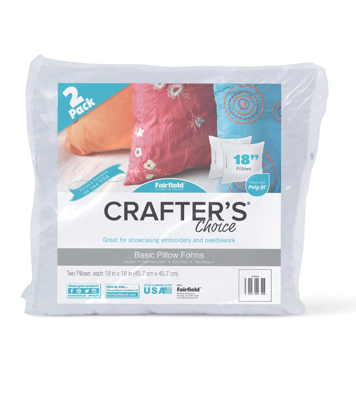 Poly-Fil Crafter's Choice pillow inserts by Fairfield are perfect for DIY or craft projects with your friends or family. Personalize them with fabric, faux fur, needlepoint, or a monogram, to add a special touch to your favorite spaces or give as gifts for those close to your heart. They are a quick, easy, and inexpensive way to change and refresh the look of a room in your house or use as holiday and seasonal décor. The firm texture allows them to retain their shape when working with heavier upholstery fabrics or heirloom pieces Crafter's Choice pillow forms are made of 100% polyester fibers with no added chemicals or flame retardants and have a non-woven polypropylene cover.