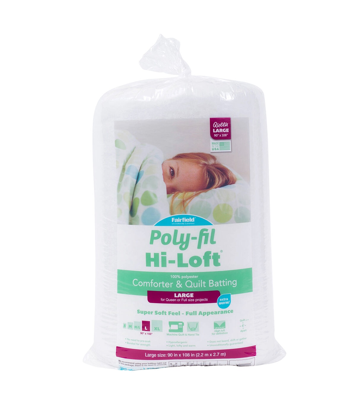 Poly-Fil® Hi-Loft® 100% bonded polyester quilt batting is appropriate for machine quilting, whole cloth, Hawaiian, duvets, and comforters or making tied quilts. The higher loft creates a fluffy plush look and feel while providing warmth without the weight. It is perfect for projects where you want a lot of definition and texture. It also works great for upholstery, home décor, school projects and holiday decorations. It will not beard, is easy to needle, hypo-allergenic and washable after quilting. The 90" x 108" Queen Size is perfect for queen bed quilts, duvets and comforters. You can create a quick and easy whole cloth quilt by choosing fabric with a larger print and quilt along the edges of the pattern in the fabric for a deep dimensional plush look in no time.