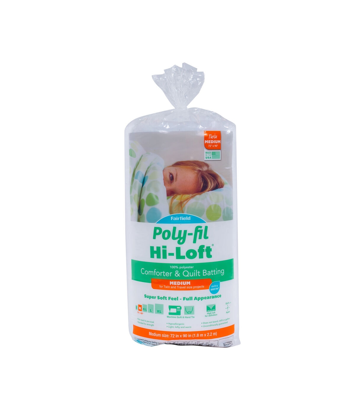 Poly-Fil® Hi-Loft® 100% bonded polyester quilt batting is appropriate for machine quilting, whole cloth, Hawaiian, duvets, and comforters or making tied quilts. The higher loft creates a fluffy plush look and feel while providing warmth without the weight. It is perfect for projects where you want a lot of definition and texture. It also works great for upholstery, home décor, school projects and holiday decorations. It will not beard, is easy to needle, hypo-allergenic and washable after quilting. The 72" x 90" Twin Size is perfect for single and day beds, dorm room, and throw quilts. You can create a quick and easy whole cloth quilt by choosing fabric with a larger print and quilt along the edges of the pattern in the fabric for a deep dimensional plush look in no time.