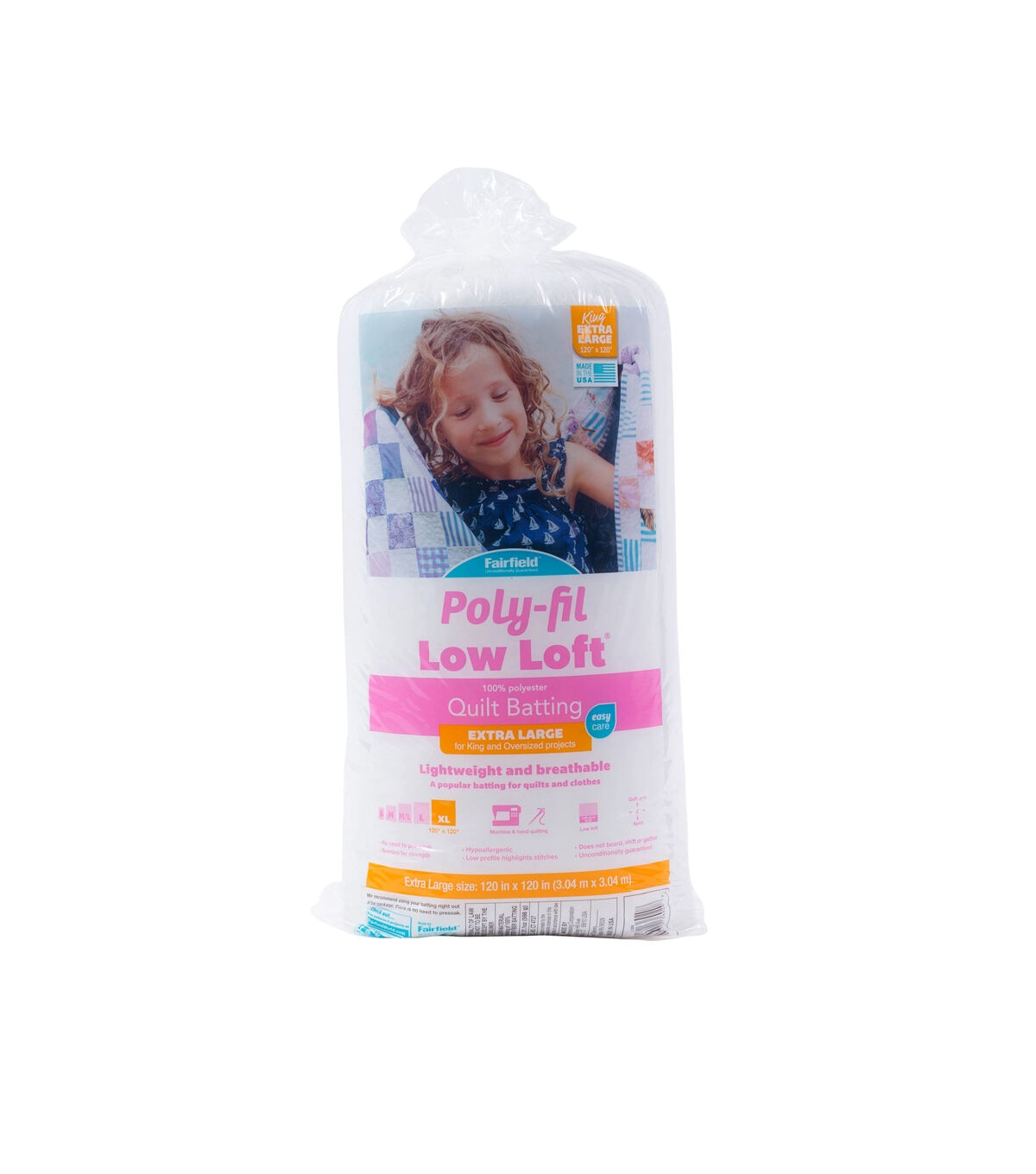 Poly-Fil Low-Loft 100% bonded polyester quilt batting sets the standard for all other 100% bonded polyester battings. It is a favorite among machine and hand quilters. It will retain its loft wash after wash and dries quickly, making it ideal for lightweight quilts and baby quilts. Hand quilters love that it is the easiest batting to needle through and accentuates tiny hand stitches. Weight: 2 oz. / sq. yd.