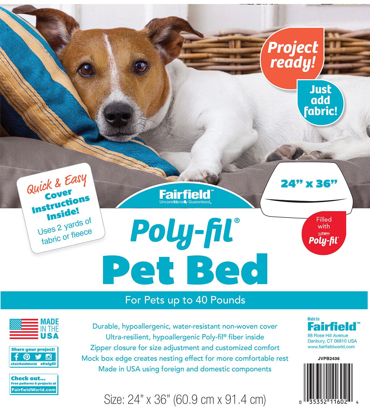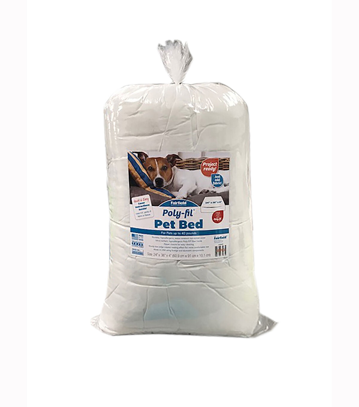 Poly-fil Pet Bed inserts come project ready! Just add fabric or fleece and create the perfect bed for your beloved pet that works with your pet’s personality or your room decor. Quick and easy cover instructions are provided. With a zipper closure, the easy to clean cover is durable, hypoallergenic, water-resistant and is filled with the ultra-resilient, hypoallergenic Poly-fil fiber inside. Our inserts have a sturdy box edge which creates a nesting effect for a more comfortable rest.