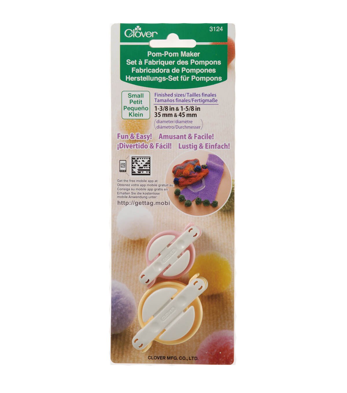 CLOVER-Pom-Pom Maker. Now you can make perfectly shaped and sized pom poms with little work and loads of fun. Pom poms are ideal for decorating scarves; hats; home decor and much more. It is as easy as 1 2 3: wind; cut; tie and remove! This package contains two makers that create 1-3/8in and 1-5/8in pom poms. Imported.