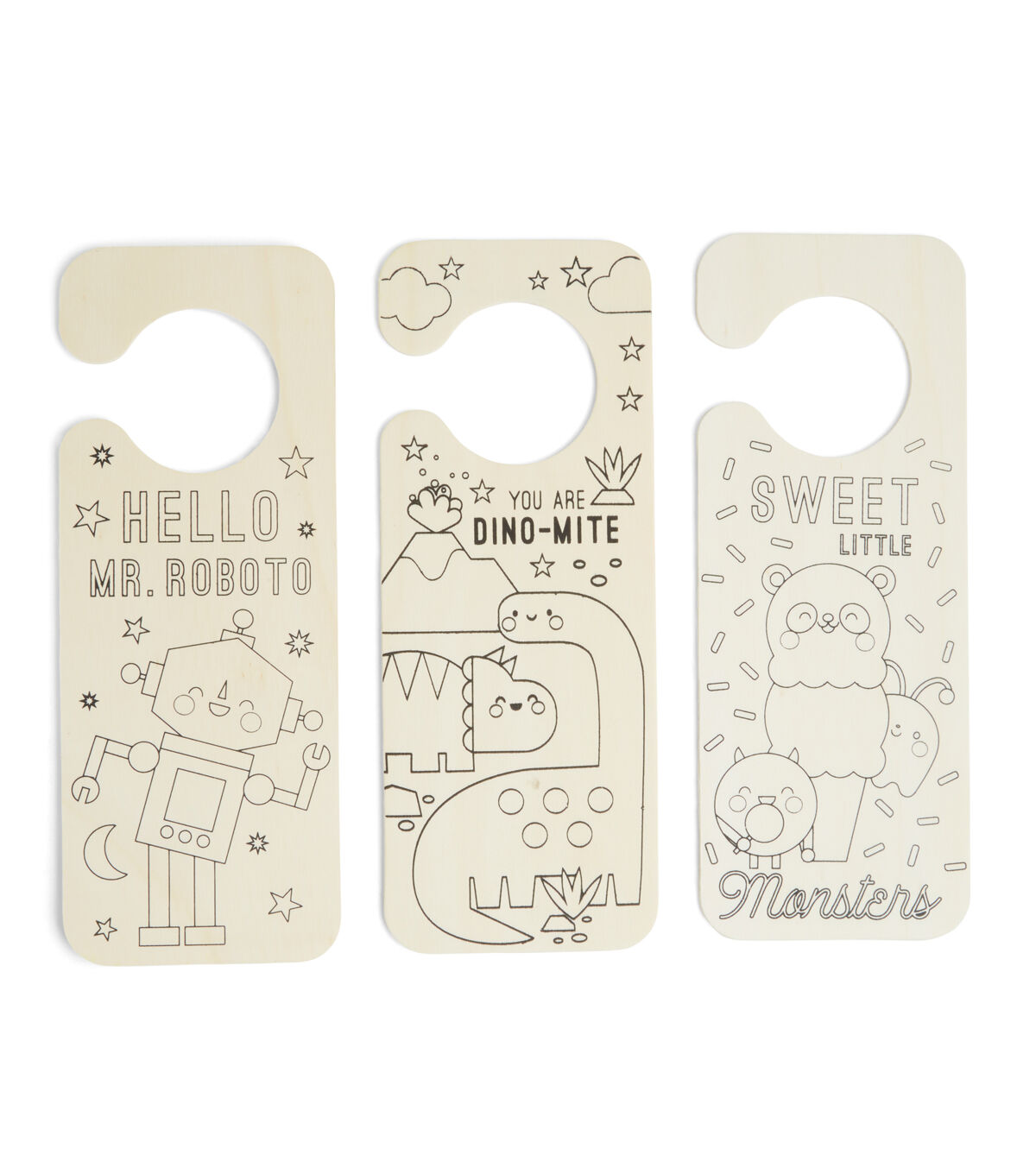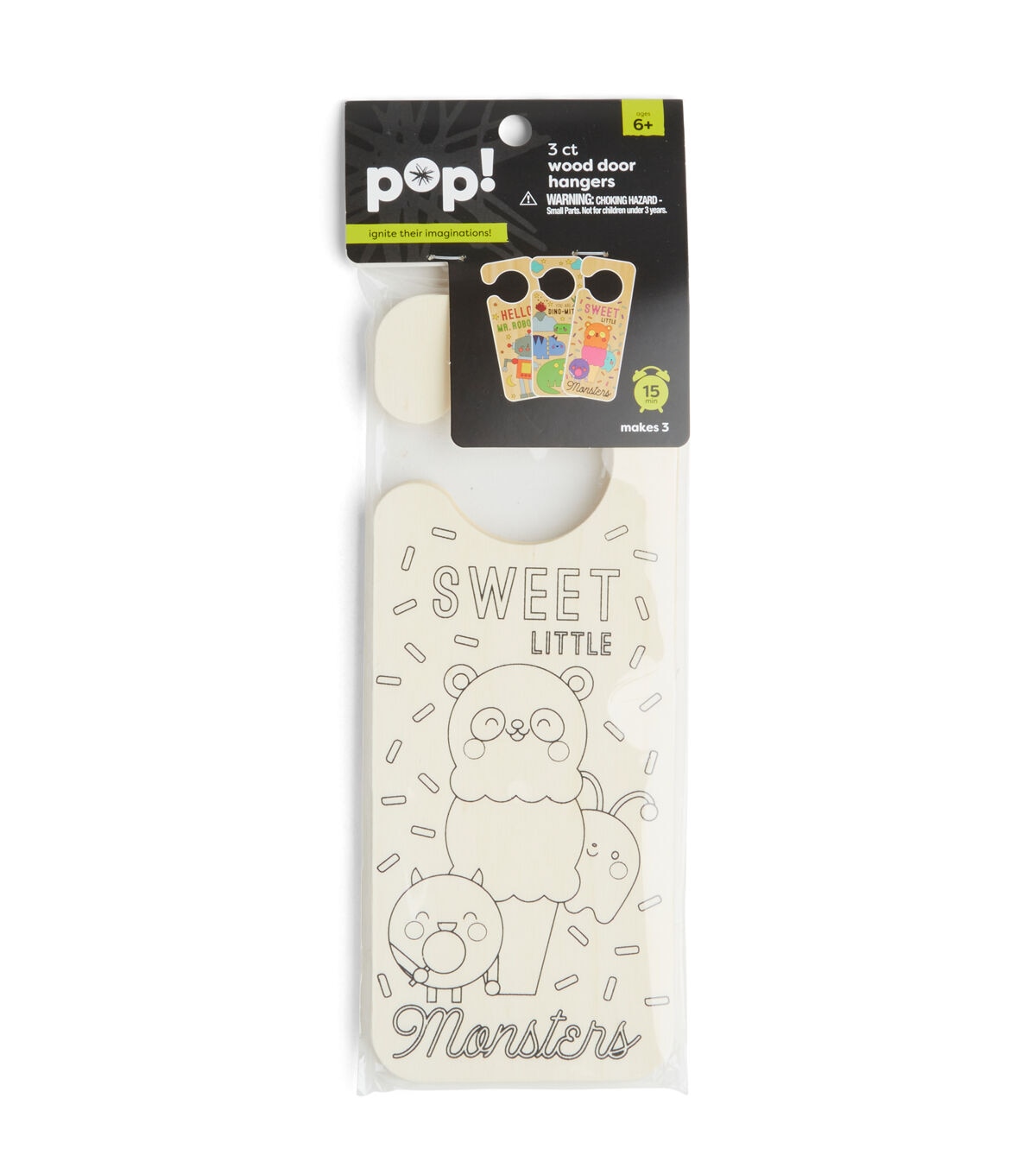Add the POP! Wooden Door Hangers - Sweet Little Monsters to your kid’ craft box and they are sure to be delighted. This pack contains three unfinished wooden door hangers that sport fun sketches. Your little one can use markers to add their artistic strokes to the hangers, dust them with glitter and hang the finished versions on the doorknob of their bedroom.