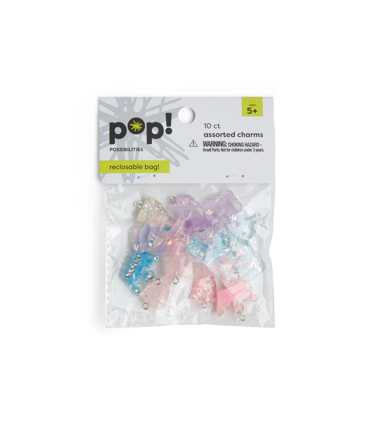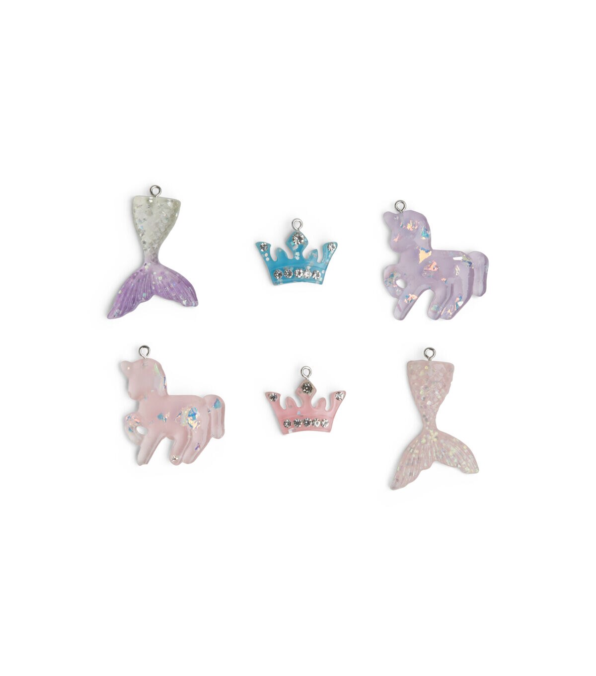 The POP! Possibilities Assorted Glitter Princess Charms - Multi are just what your little crafter needs to create whimsical-themed jewelry pieces. This pack includes 10 charms that are shaped like crowns, mermaid tails, unicorns and more. These charms sport lovely hues and are adorned with glitter. Your little one can team them with gold-toned chains to create lovely necklaces or bracelets that they can wear to costume parties.