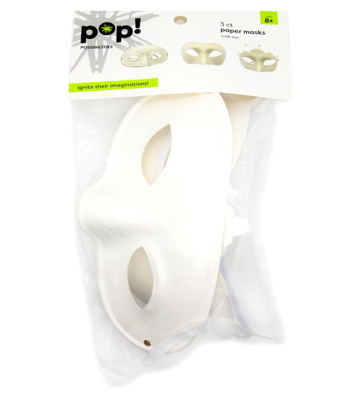 Add the POP! Possibilities Paper Masquerade Masks - White to your children’s craft box and they're sure to be delighted. This pack includes three masquerade masks that they can decorate with fabric or papercrafting embellishments or paint them in their favorite colors. Your kids can wear the decorated masks to a costume party.