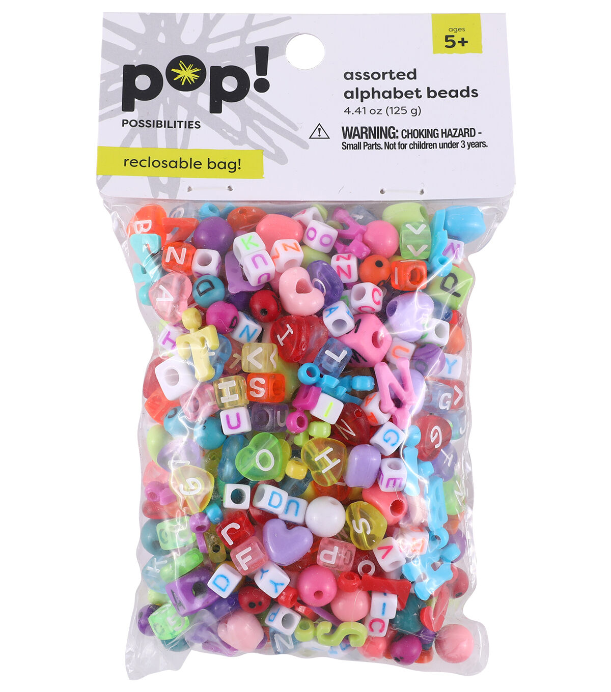 Crafting will be fun for your kids with the POP! Possibilities Assorted Alphabet Beads. This pack contains colorful beads in different shapes and sizes, each printed with a letter of the alphabet. Your child can team them with solid-colored beads and create pretty name bracelets and necklaces. These beads can also be used to make personalized keychains, hair accessories and more.