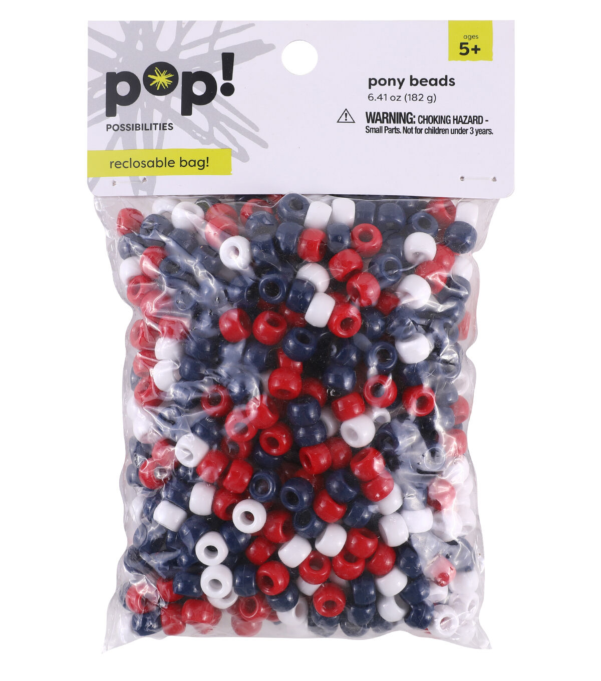Your kids can use the POP! Possibilities Pony Beads - Red, White & Blue in a range of craft and jewelry projects. This pack includes beads in shades of blue, red or white. These beads can be teamed with letter beads, tassels or charms to create bracelets, keychains and hair accessories. You can also use these beads to create a lovely patriotic-themed decor accent.