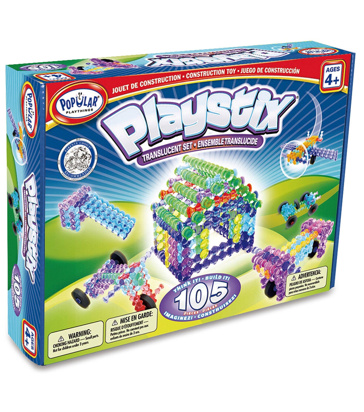 Welcome to Translucent Playstix, a construction toy that allows you to build the ordinary and inspires you to build the extraordinary! Translucent Playstix jewel-like colors reflect light and will add real sparkle to anything you build. And, they may be combined with regular and flexible Playstix for a totally new look! STEM Supporting. Open ended play with suggested projects included. Includes 105 transparent pieces: 26 yellow, 21 light blue, 13 purple, 7 red, 14 dark blue, 10 green, 6 orange, 4 small wheels, 4 large wheels and idea booklet.