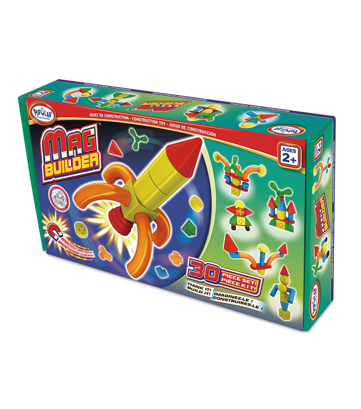 Welcome to Mag Builder, an exciting way to build! Mag Builder was designed with the younger child in mind. The pieces are colorful, oversized and easy to hold. And, they magnetically snap together and come apart again and again! Unlike many construction toys there is no "correct way" to build with Mag Builder. This allows the child to "think outside the box" and help s develop abstract thinking. An instruction sheet showing over 20 models to build is included. Unique building block system for children 2+. Multiple magnetic points on most blocks, allowing for creative building. Recommended for ages 2-7 years. Includes 30 assorted magnetic blocks and 20 suggested models to build.
