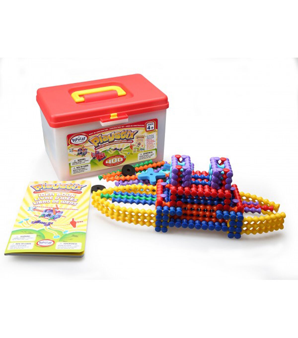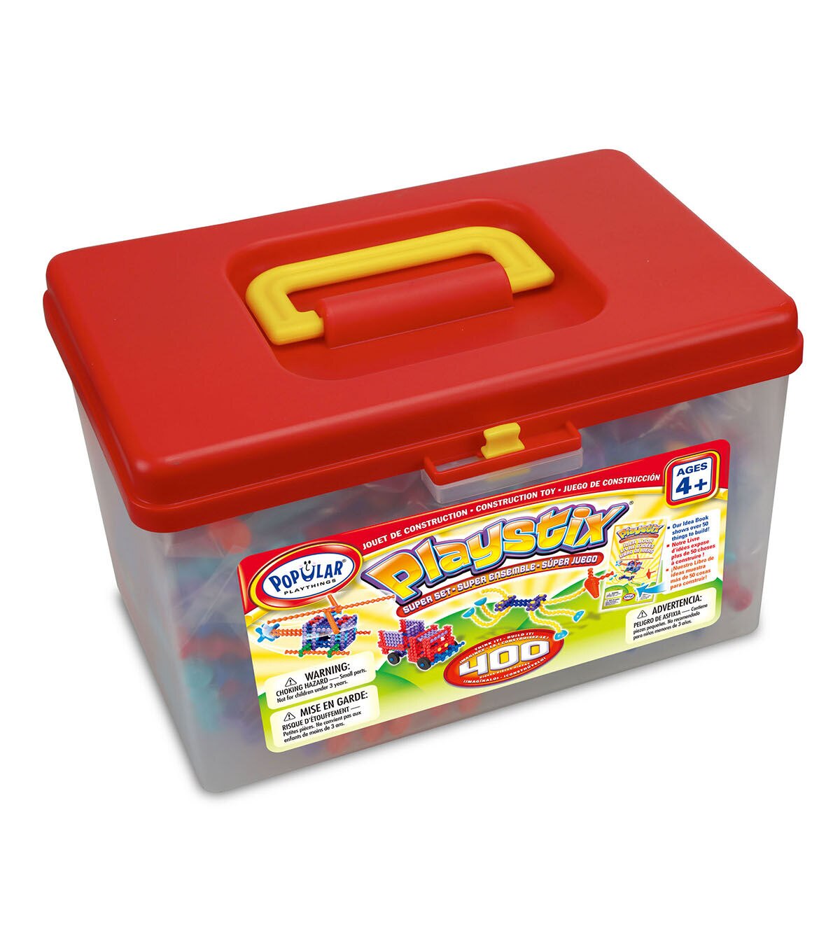 Playstix Super Set includes enough pieces to build larger, more intricate models and our new crazy creatures. You get 400 pieces, including wheels, propellers, Flexible Playstix, molded Snap-On heads and feet, and an oversized Idea Book that shows over 50 things you can build with this Super Set. And to help you store and carry your Playstix Super Set, we've included a plastic storage box with a handy handle! STEM Supporting. Open ended play with suggested projects included. Includes 348 Playstix pieces: 38 yellow, 60 light blue, 80 purple, 70 red, 60 dark blue, 20 green, 20 orange, 16 Flexible pieces (8 yellow short, 8 yellow long) 10 small wheels, 10 large wheels, 6 propellers, 8 snap on feet, 2 snap on heads, plastic carrying case and idea booklet.
