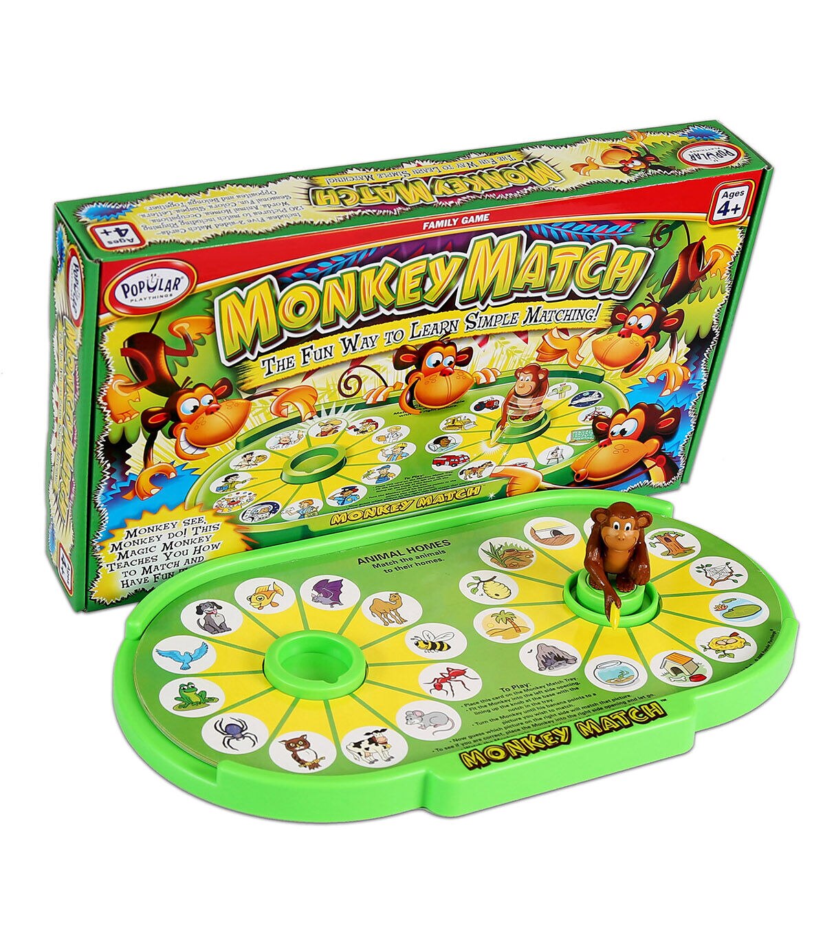 Winner of a Parents' Choice Silver Honor Award! No matching game can hold a child's interest like Monkey Match! To play, just select one of five colorful two-sided match cards and place it in the tray. Then place the magic monkey in the center on the left side of the card and point his banana to the picture, letter, shape, or color you want to try and match. Then select the image on the right side of the card that best matches your selection. To see if you are right, place the monkey in the center on the right side of the card and let go. He will mysteriously spin and point to the correct match. This little monkey's actions will even amaze adults and he does it all without batteries! How does the monkey know? Includes one card base, one monkey and 5 double-sided basic skills cards. Recommended for ages 3-6 years.