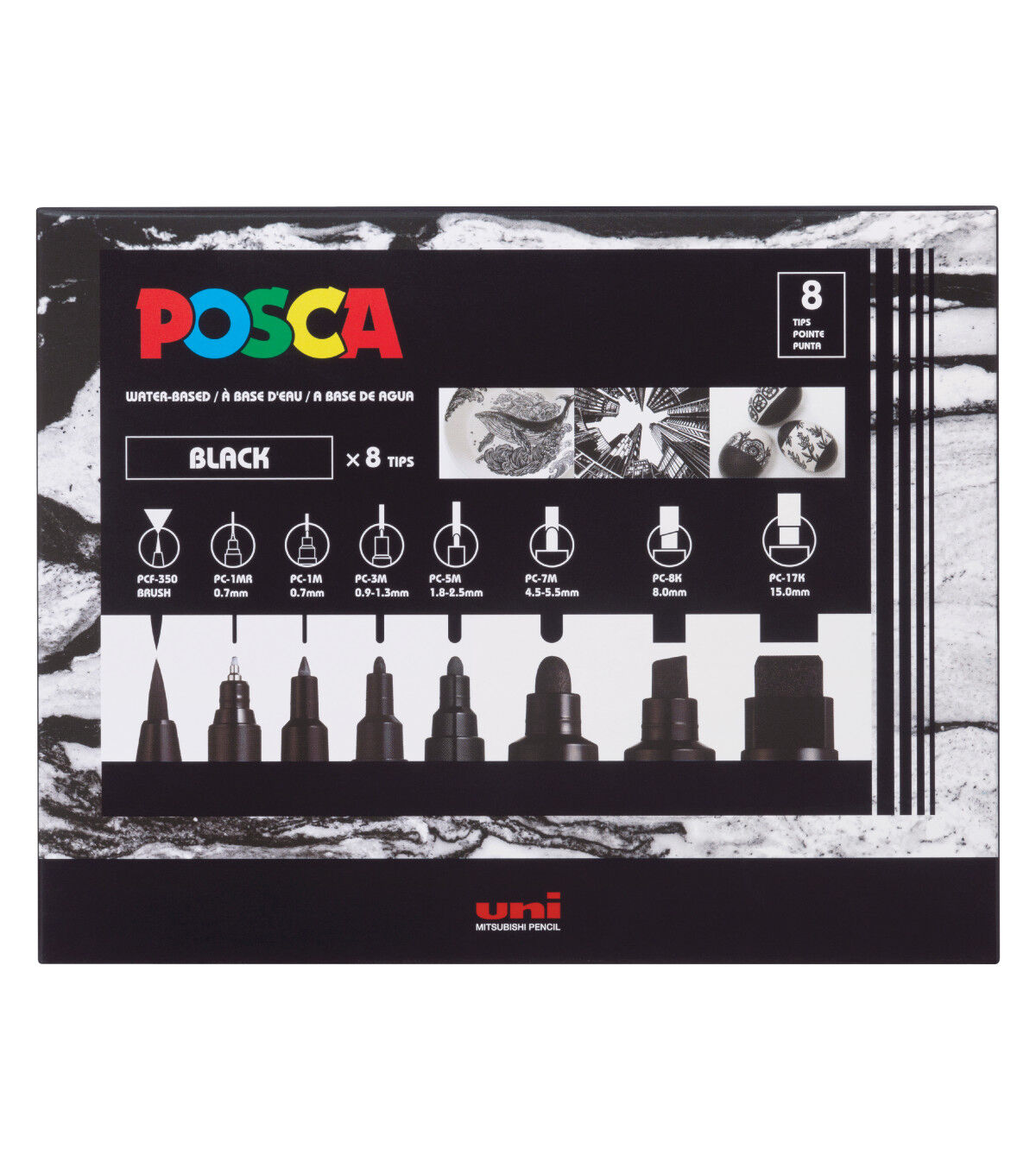 Non-toxic, water-based POSCA paint markers can be used on almost any surface, and are loved by professionals, creative hobbyists and amateurs alike. The alcohol and solvent-free opaque paint covers well, is blendable, dries quickly and can be overlaid when dry. ACMI certified and made in Japan. All eight tip sizes in black (PCF-350 brush, PC-1MR extra-fine, PC-1M extra-fine tapered, PC-3M fine, PC-5M medium, PC-7M broad, PC-8K broad chisel, PC-17K extra-broad.