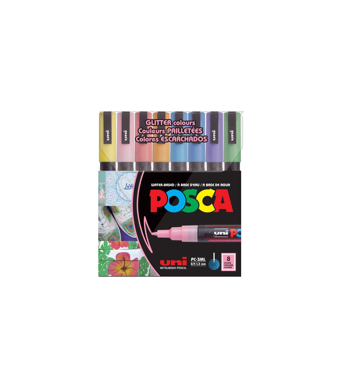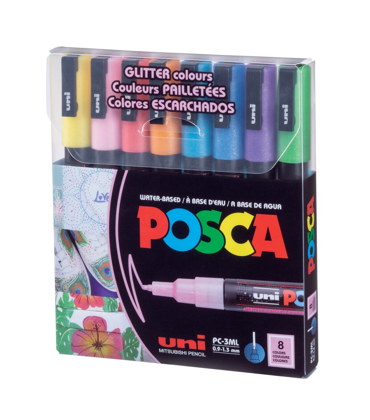 Non-toxic, water-based POSCA paint markers can be used on almost any surface, and are loved by professionals, creative hobbyists and amateurs alike. The alcohol and solvent-free opaque paint covers well, is blendable, and can be overlaid when dry. ACMI certified and made in Japan. This set includes glitter blue, glitter red, glitter yellow, glitter orange, glitter violet, glitter pink, glitter green and glitter light blue.