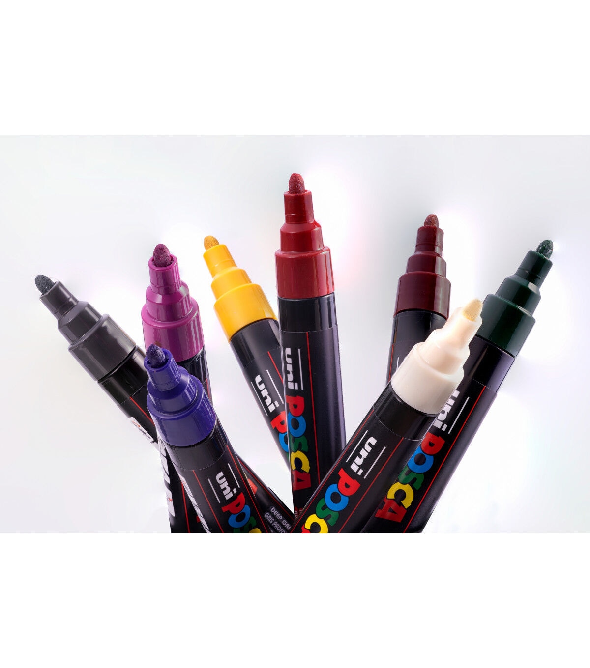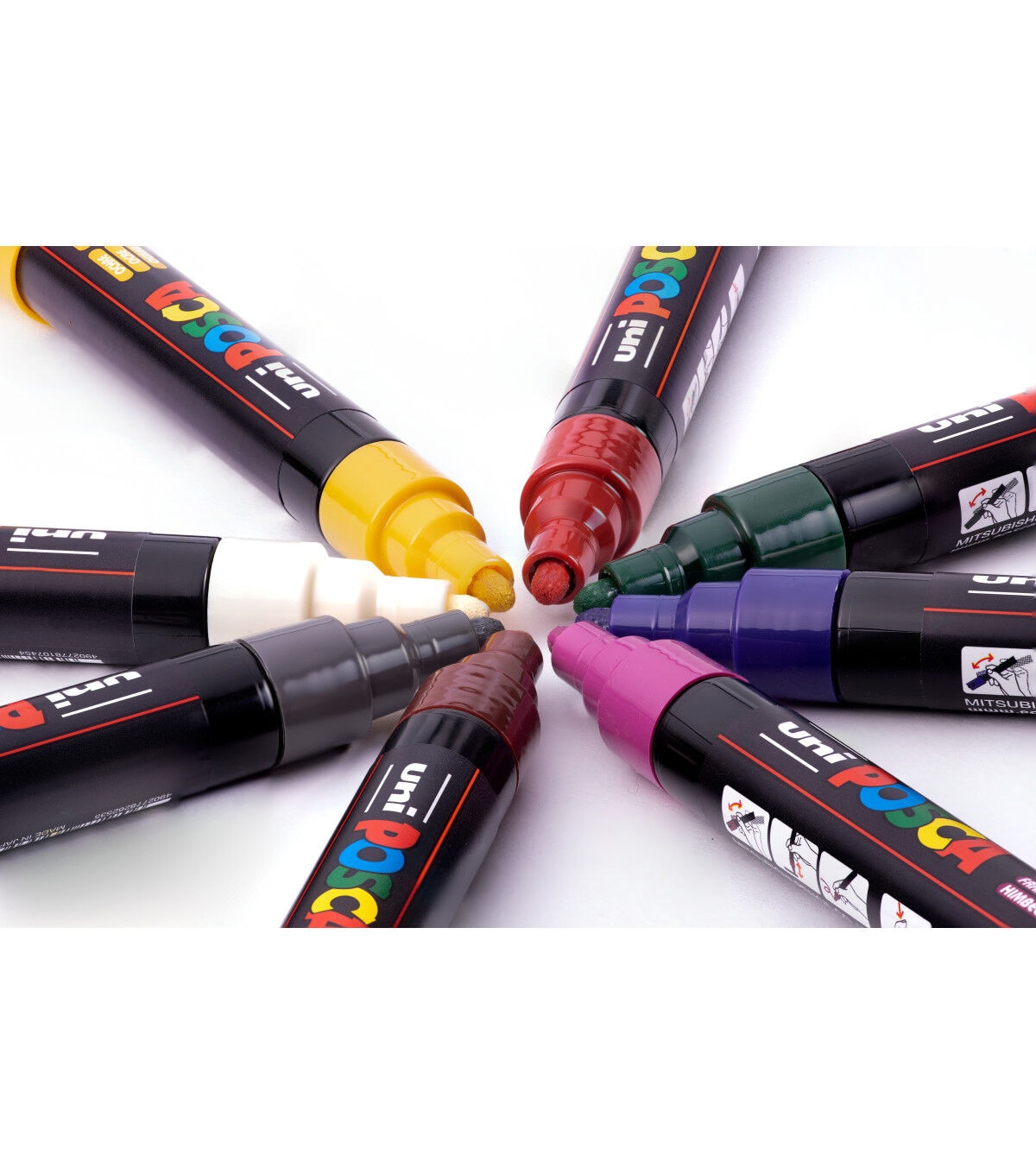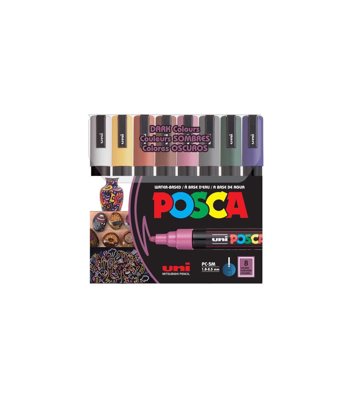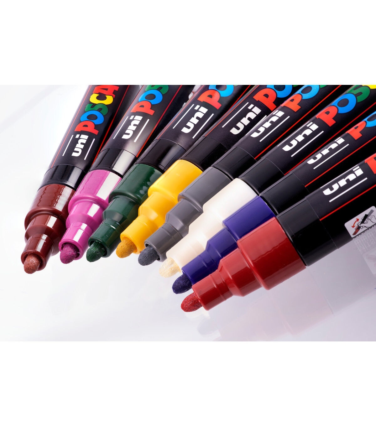 Non-toxic, water-based POSCA paint markers can be used for drawing on almost any surface, and are loved by professionals, creative hobbyists and amateurs alike. The alcohol and solvent-free opaque paint covers well, is blendable, and can be overlaid when dry. ACMI certified and made in Japan. This set includes deep grey, english green, ruby red, prussian blue, ochre, cacao brown, white and raspberry.