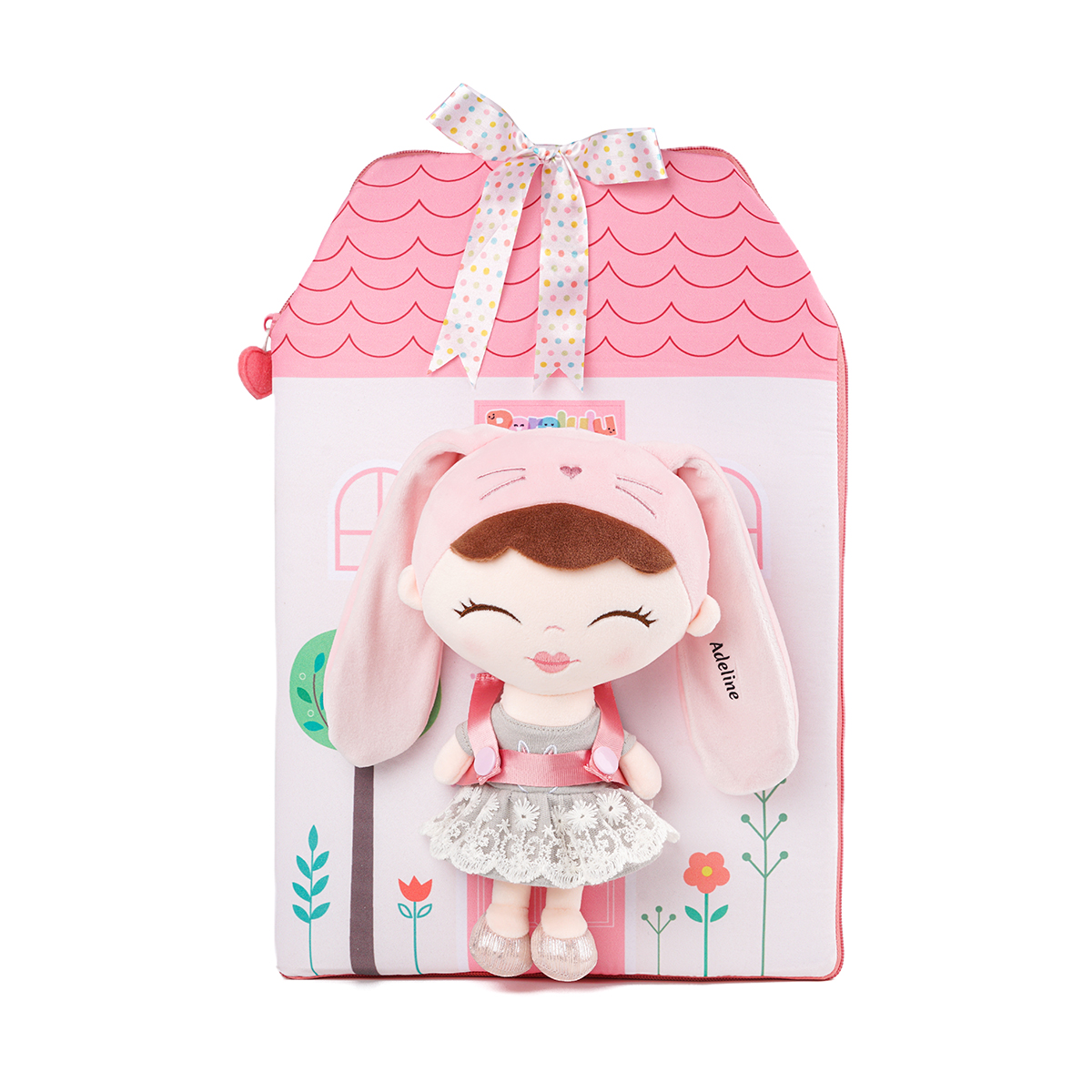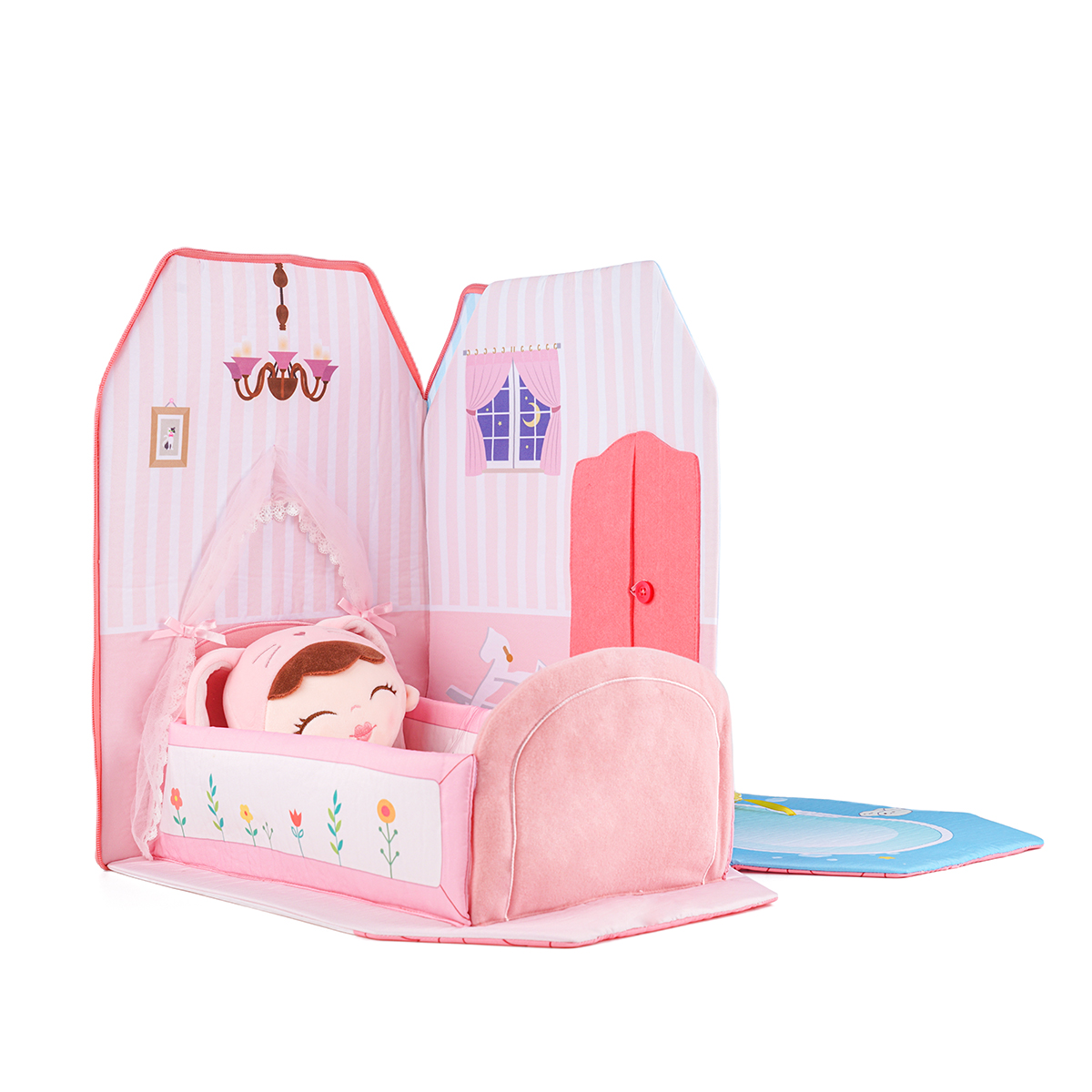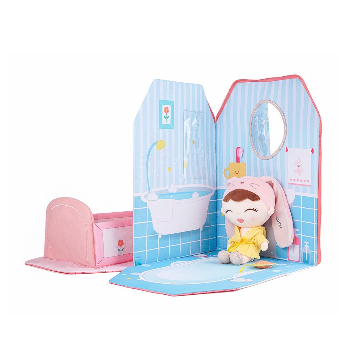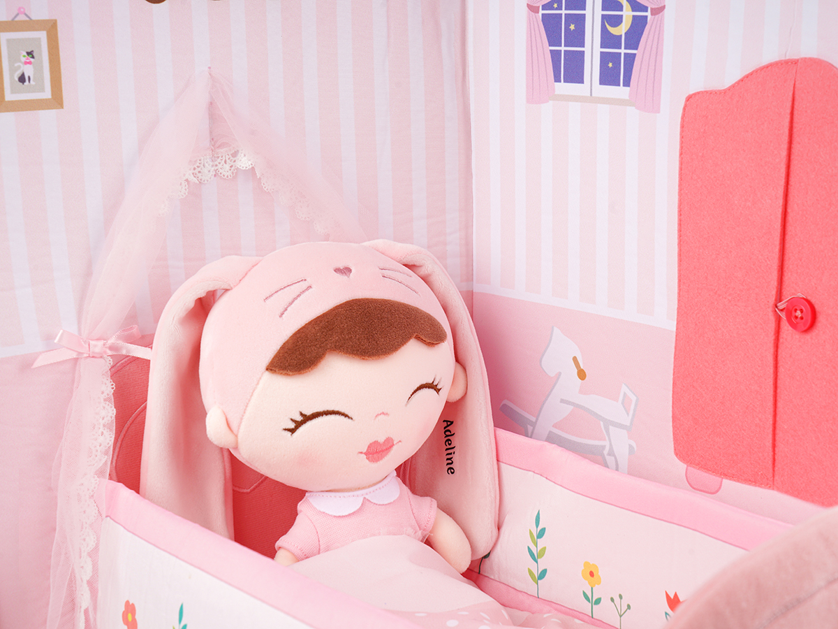 This is a very creative portable mobile room cloth book! It looks like a cozy house, which can be folded when you take it out. The pink rabbit toy is fixed by a pink ribbon on the cover. The cloth book has a zipper on the side and two shoulder straps on the back for easy carrying. When the child arrives at the destination, it can be unfolded to form a connected bedroom and bathroom and rest in sync with the owner. It is a perfect product for your baby to travel with!