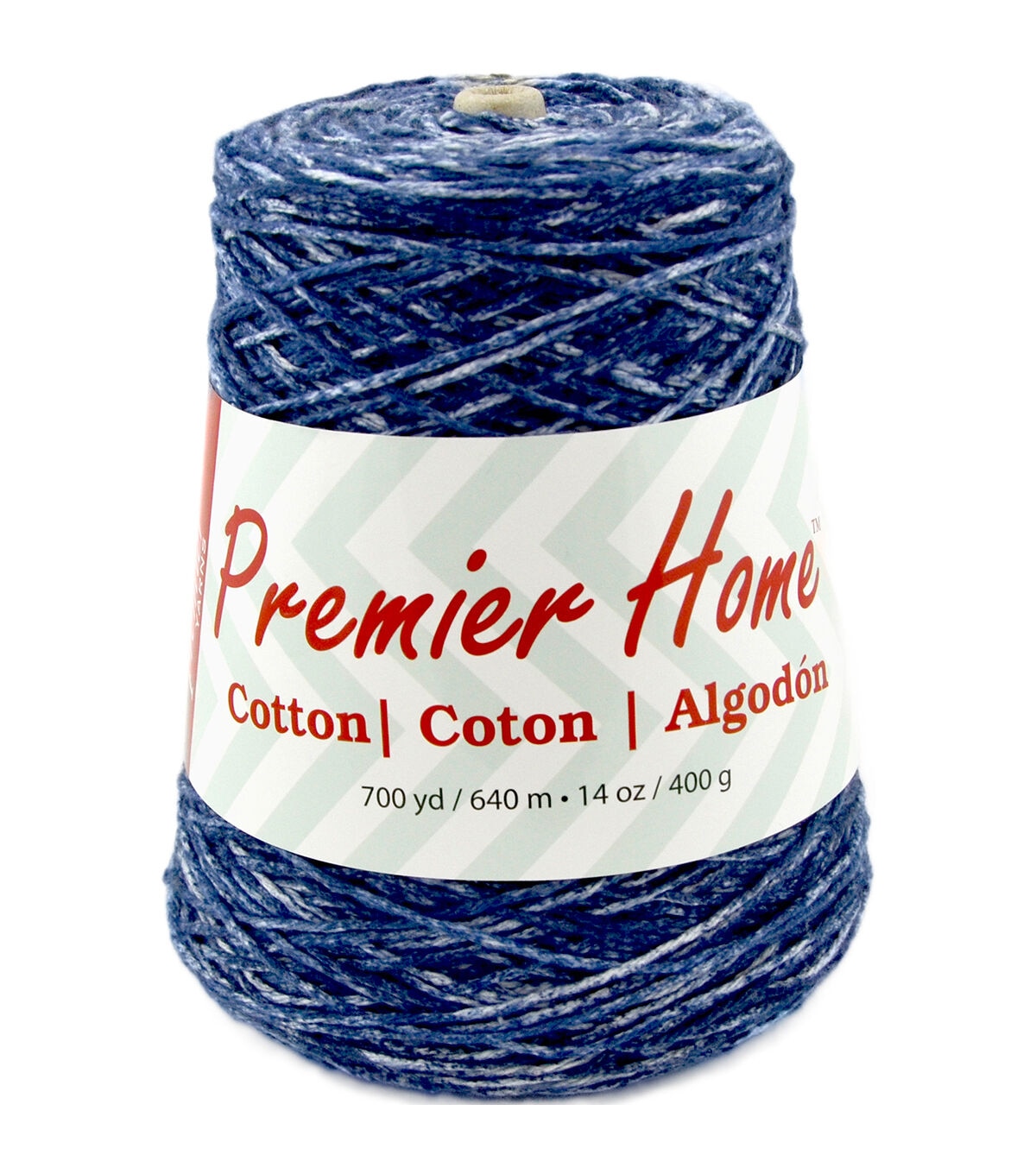 Premier Yarns-Home Cotton Yarn: Multi Cone. This soft cotton/polyester blend is perfect for washcloths and home decor projects. Weight category: 4. Content: 85% Cotton/15% Polyester. Putup: 14oz/400g, 700yd/640m. Gauge: 18sx24r = 4in/10cm on size US8/5mm knitting needles. Suggested crochet hook size US I-9/5.5mm. Dyelotted: we try but are not always able to match dyelots. Care: Machine wash, tumble dry low, do not bleach, do not iron, do not dry clean. Comes in a variety of colors. Each sold separately. Imported.