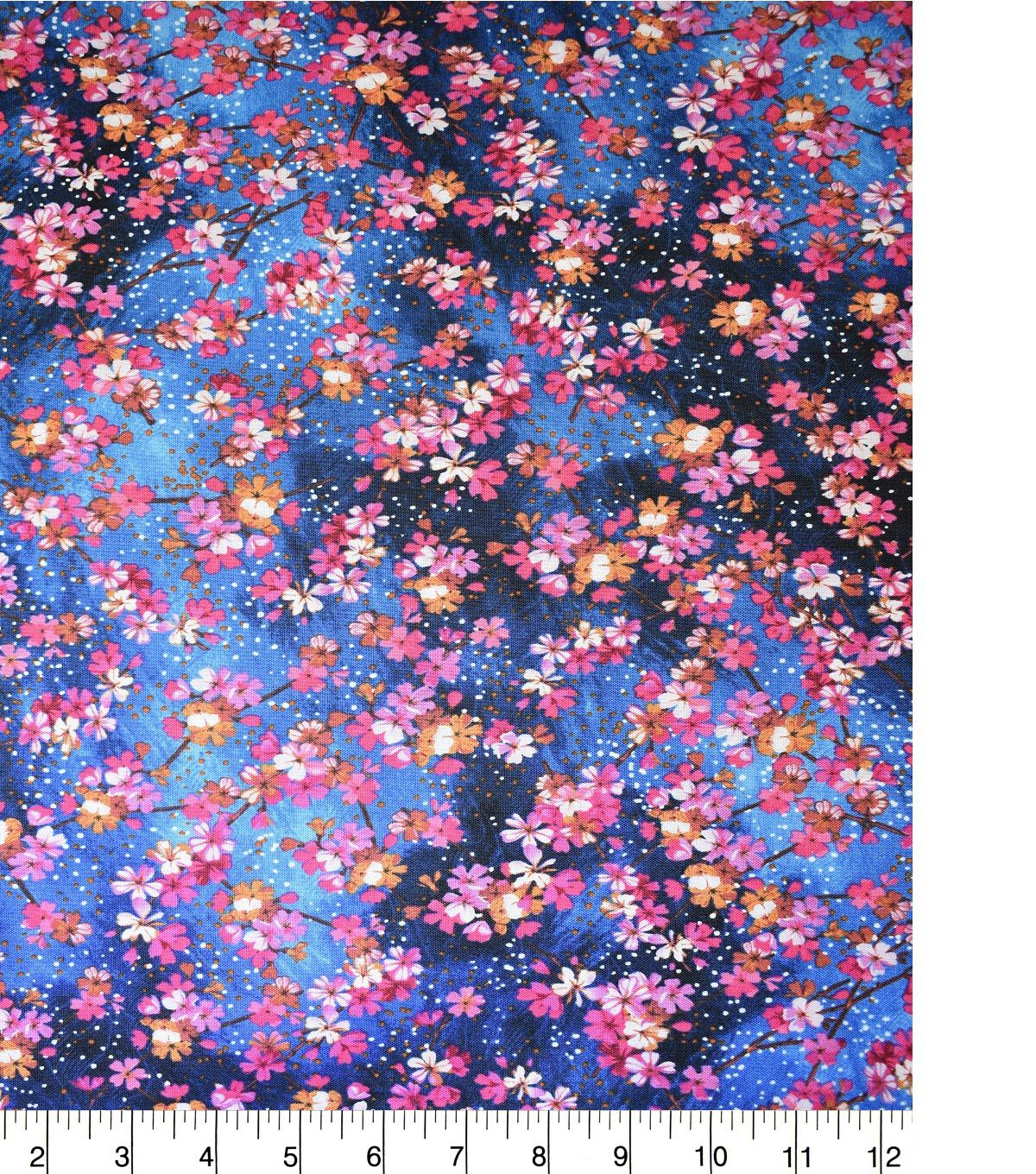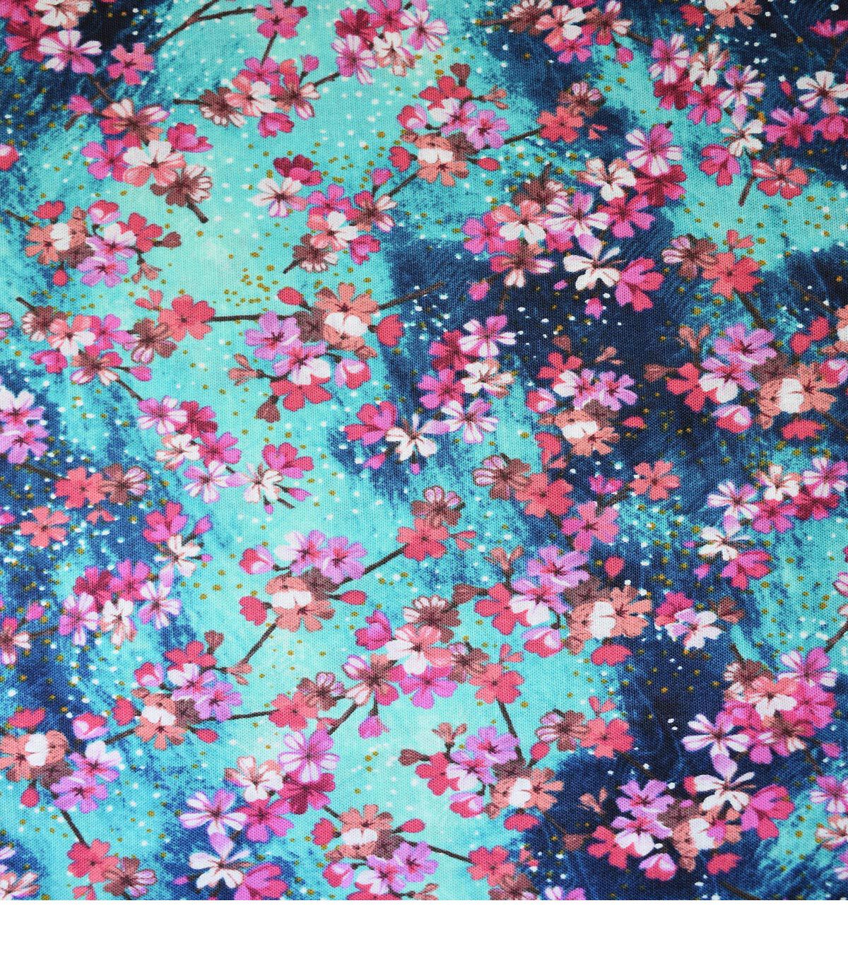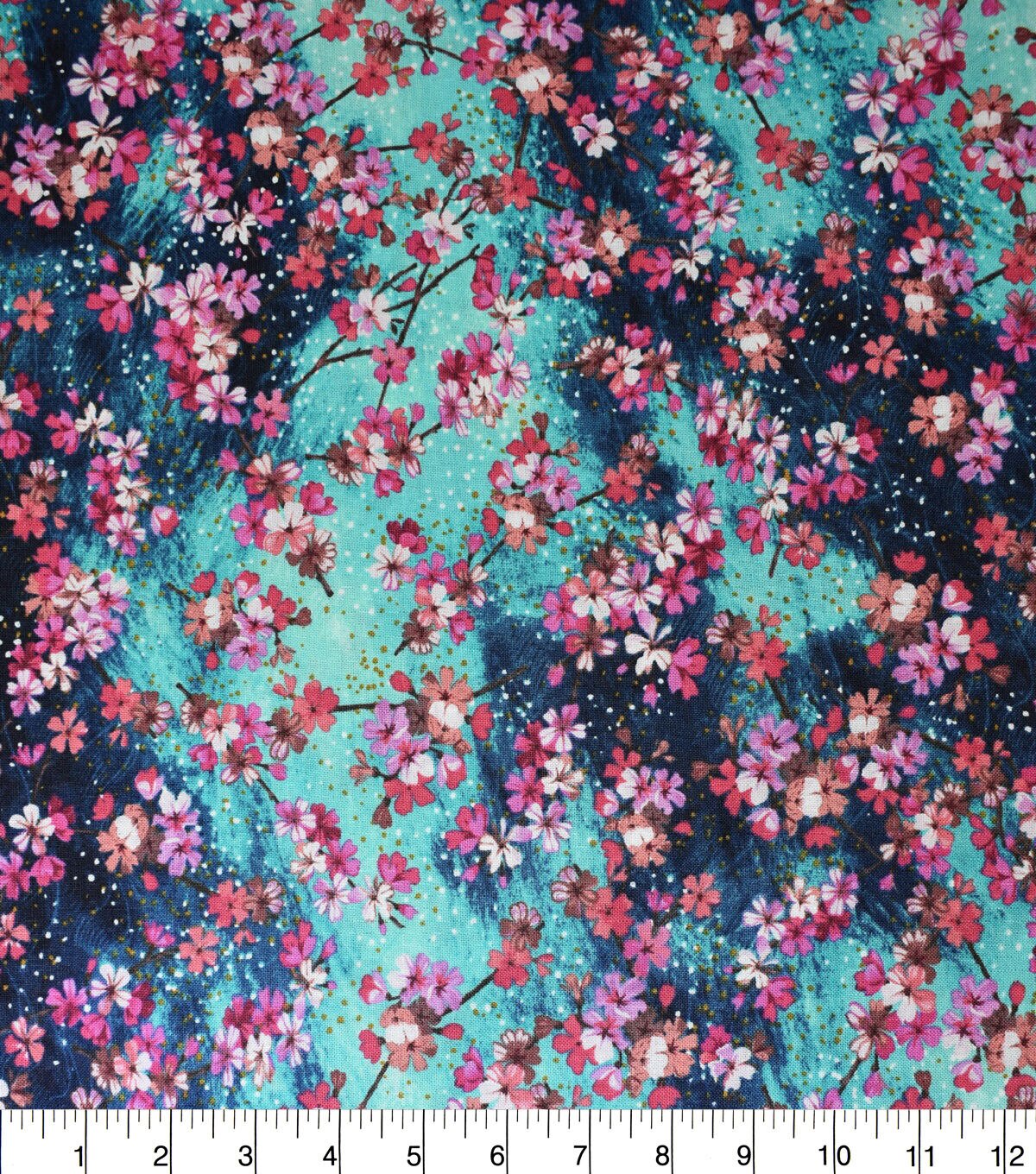 Premium Prints Cotton Fabric Painted Cherry Blossom Teal