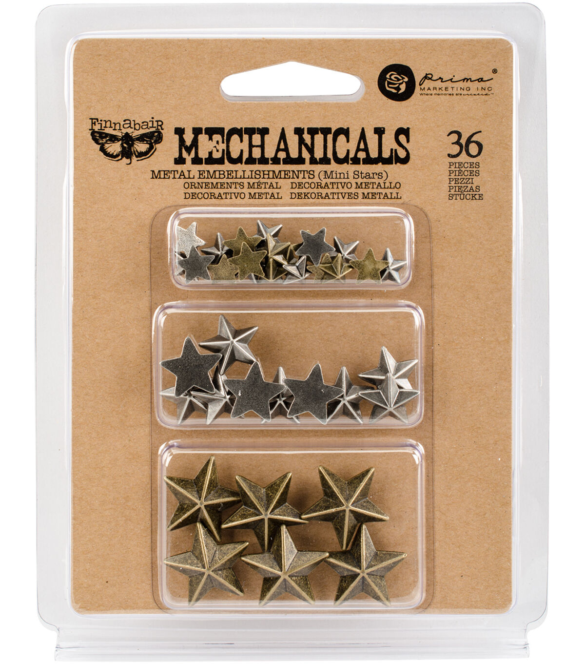 Prima Marketing-Finnabair Mechanicals Metal Embellishments: Mini Stars. Take your projects to the next level with metal embellishments! Each trinket boasts character, fine details and style, that have been amplified by the new finishes. This 6x4-1/2 inch package contains thirty-six metal embellishments in assorted sizes. Imported.