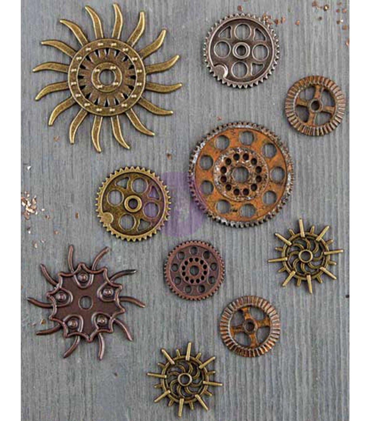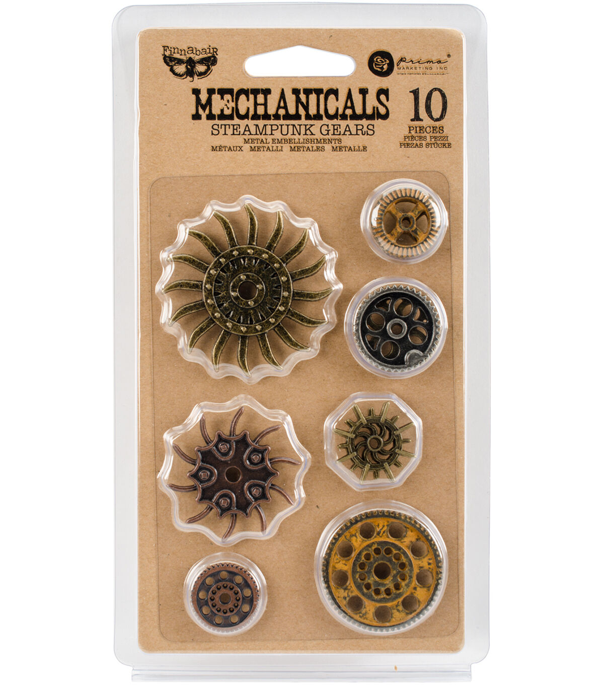 Prima Marketing-Finnabair Mechanicals Metal Embellishments: Steampunk Gears. Take your projects to the next level with metal embellishments! Each trinket boasts character, fine details and style, that have been amplified by the new finishes. This 7-3/4x4- 1/2 inch package contains ten metal embellishments in seven designs (one or two of each design). Imported.