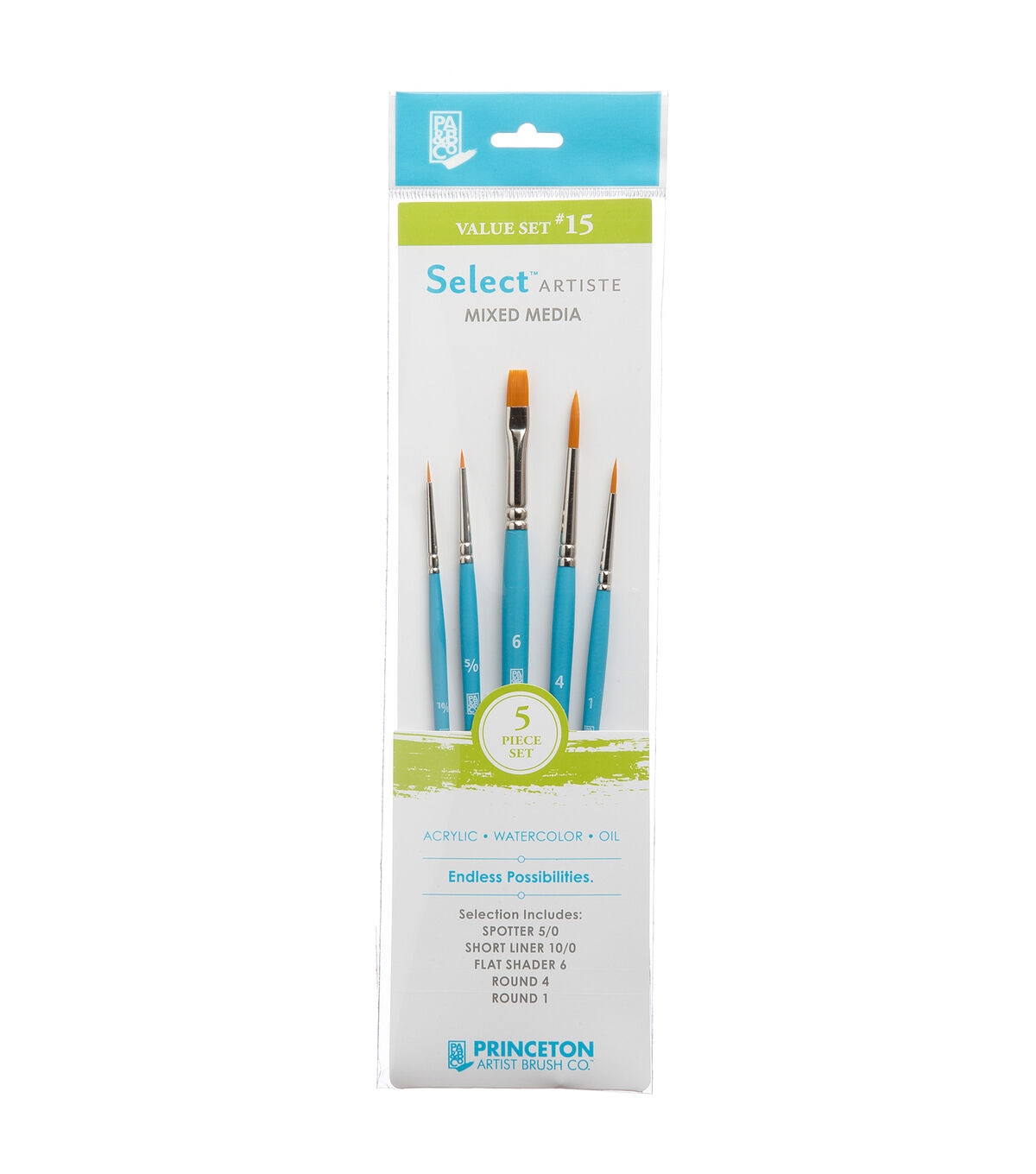 The Princeton Artist Brush Co. Select Artiste Brush Value Set #15 features a variety of assortments of brushes that work well together. These high-quality, short-handled brushes are made to last. With their robin's egg blue colored handles, they will be a beautiful addition to your existing brush collection as they go above and beyond basic brush shapes and sizes.
