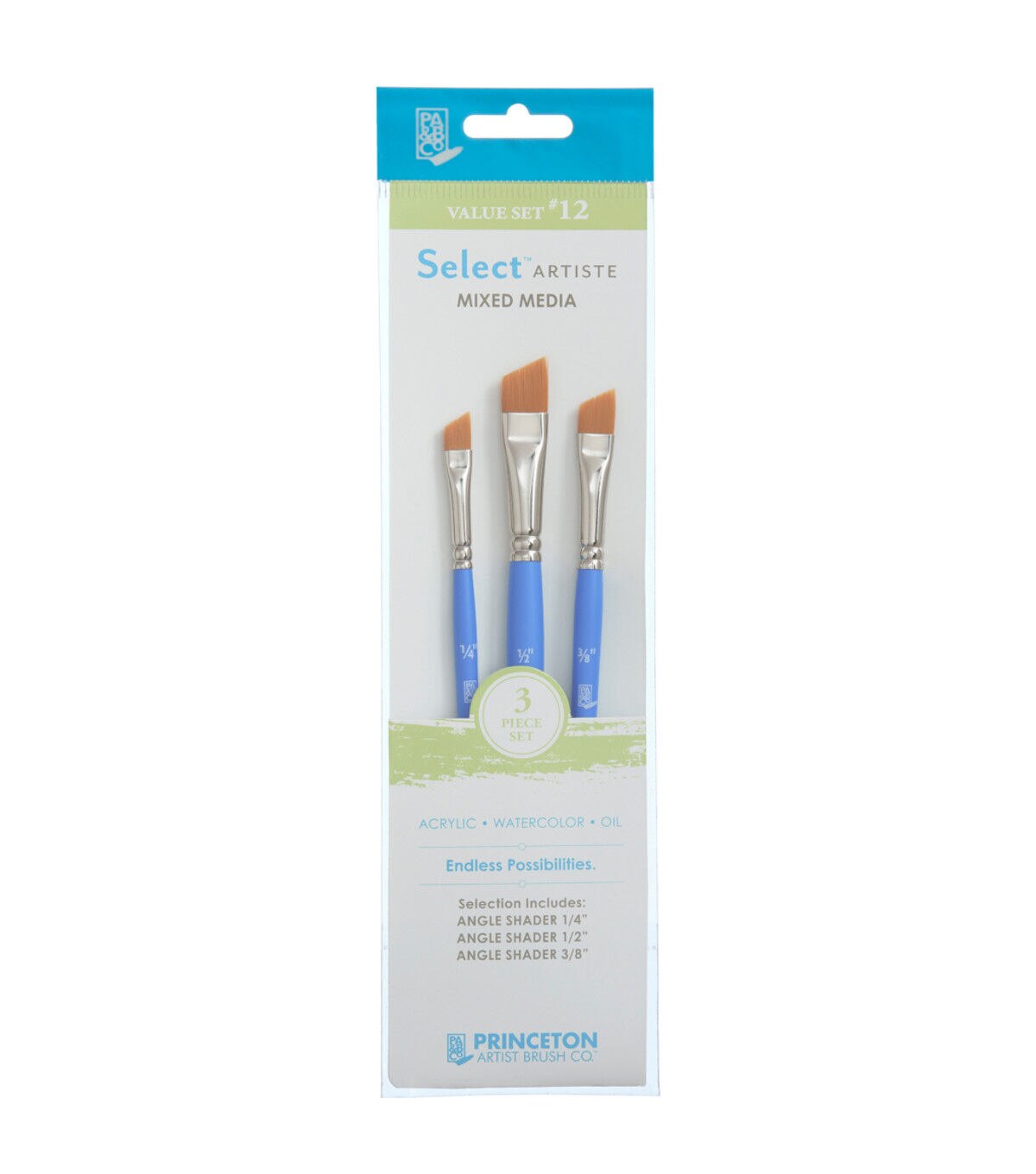 Explore traditional and avant-garde techniques on nearly any surface! Princeton's Select Artiste mixed-media brush sets feature a variety of assortments of brushes that work well together. These quality, short handled brushes are made to last. With their robin's egg blue colored handles, they will be a beautiful addition to your existing brush collection as they go above and beyond basic brush shapes and sizes. This set includes a Angle Shader, 1/4", 3/8" & 1/2".