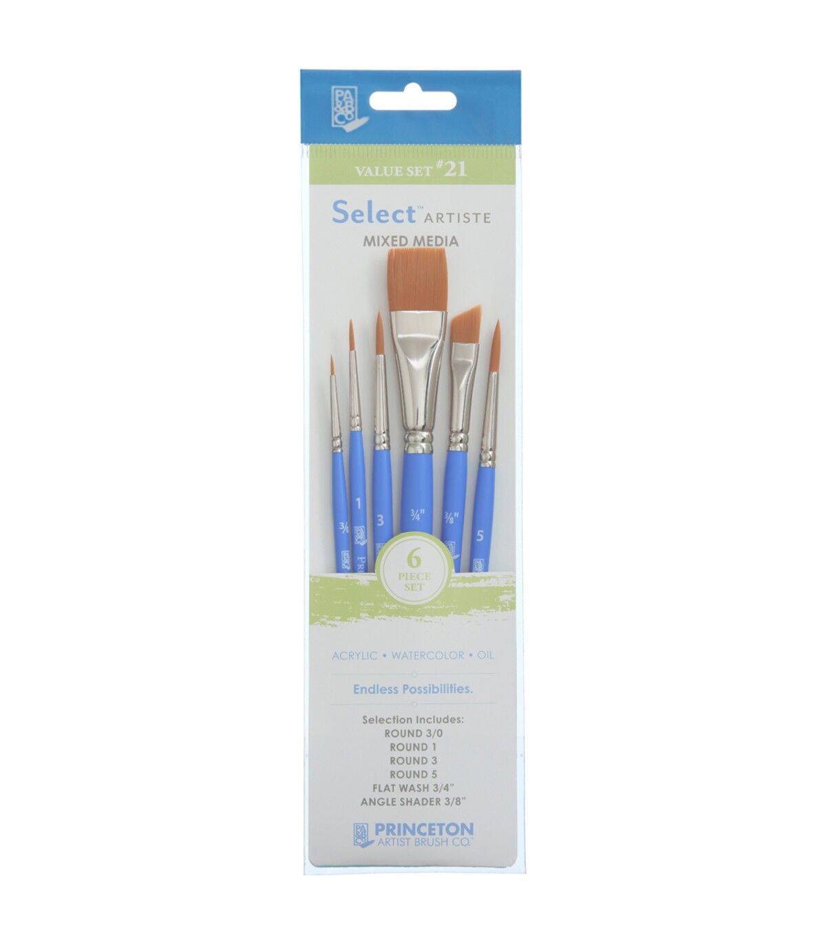 Explore traditional and avant-garde techniques on nearly any surface! Princeton's Select Artiste mixed-media brush sets feature a variety of assortments of brushes that work well together. These quality, short handled brushes are made to last. With their robin's egg blue colored handles, they will be a beautiful addition to your existing brush collection as they go above and beyond basic brush shapes and sizes. This set includes a Round, 3/0, 1, 3 & 5, Flat Wash, 3/4" & Angle Shader, 3/8".