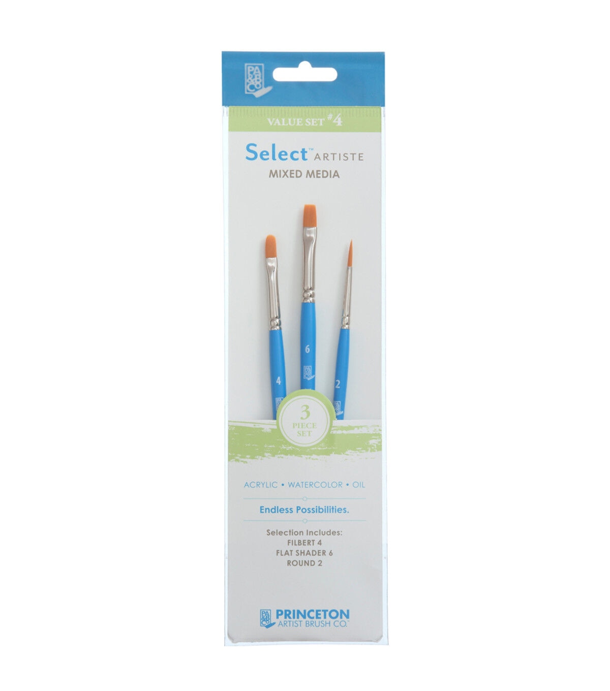 Explore traditional and avant-garde techniques on nearly any surface! Princeton's Select Artiste mixed-media brush sets feature a variety of assortments of brushes that work well together. These quality, short handled brushes are made to last. With their robin's egg blue colored handles, they will be a beautiful addition to your existing brush collection as they go above and beyond basic brush shapes and sizes. This set includes a Filbert, 4, Flat Shader, 6 & Round, 2.