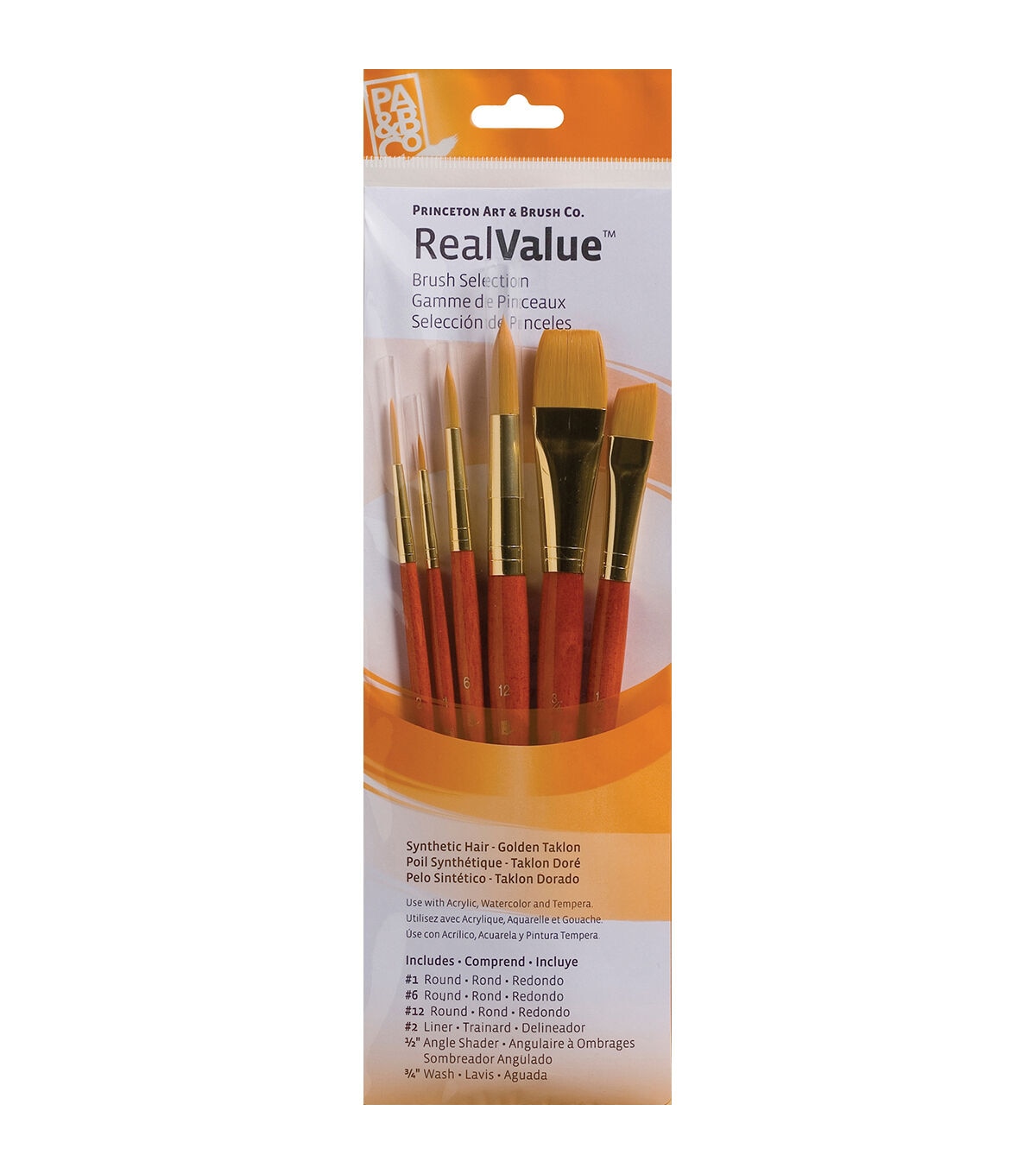 PRINCETON ART & BRUSH-Real Value Brush Set. Perfect for acrylic; watercolor and tempera. An outstanding value and the broadest range available for both novice and professional artists! Tri-lingual packaging is a plus. Has short and long handle brushes to meet every painting need. This 11x2-3/4 inch package contains three round brushes in sizes 1; 6 and 12; one liner brush in size 2; one angle shader brush in size 1/2 and one wash brush in size 3/4. Brushes are made with synthetic golden taklon hair. Imported.
