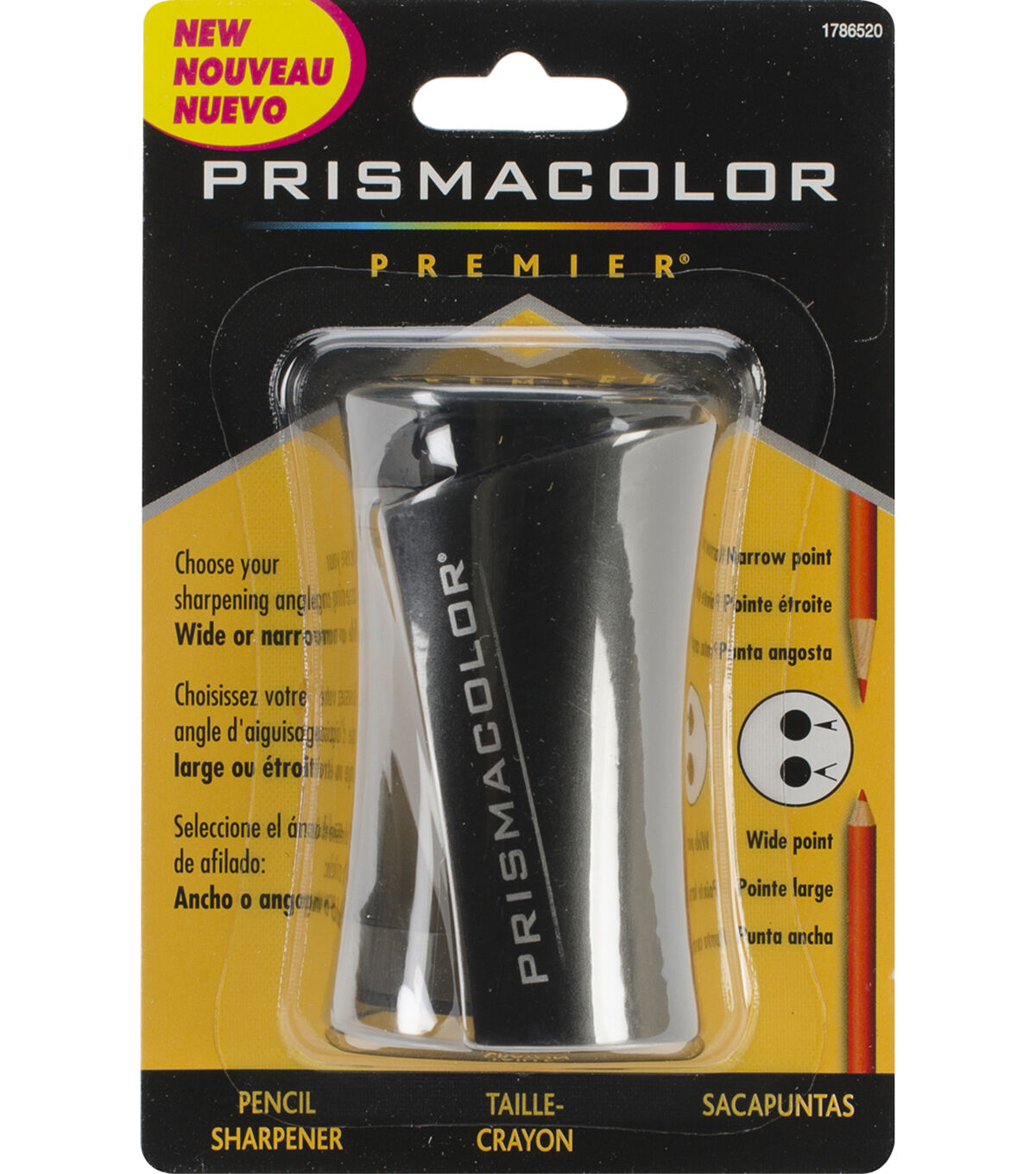 The Prismacolor Premier Pencil Sharpener is specifically designed to sharpen Prismacolor pencils to the perfect point. Choose either a wide or narrow angle. The translucent cover keeps shavings inside until ready to empty, and the blades are made of high-quality steel. This pack contains one pencil sharpener.