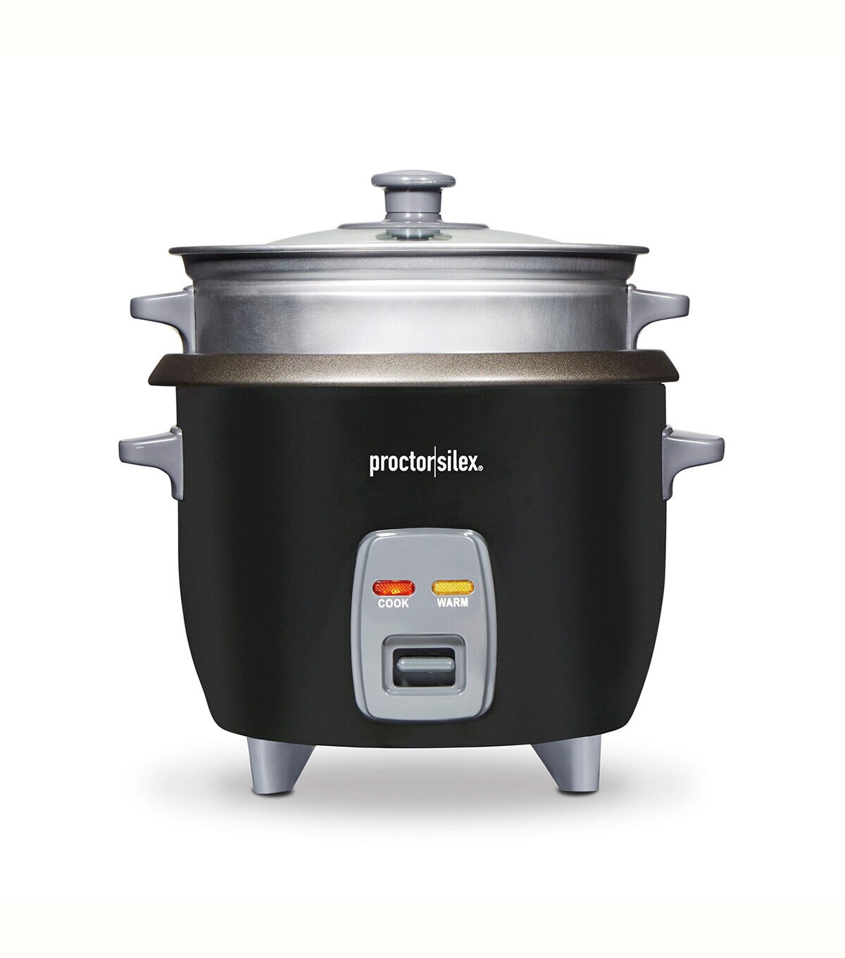 Perfectly cook side dishes or meals with this rice cooker and steamer. Great for oatmeal brown rice steaming vegetables and more. Compact size cooks up to 6 cups of cooked rice (3 uncooked rice). One-touch button does all the work for your. Automatically switches to warm when cooking is done. Aluminum steamer basket doubles as colander. Removable bowl and lid are dishwasher safe. Includes rice measuring cup and spatula. Dimensions: 9.5"H x 9.4"W x 8.5"D.