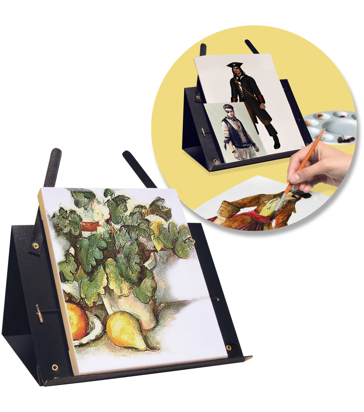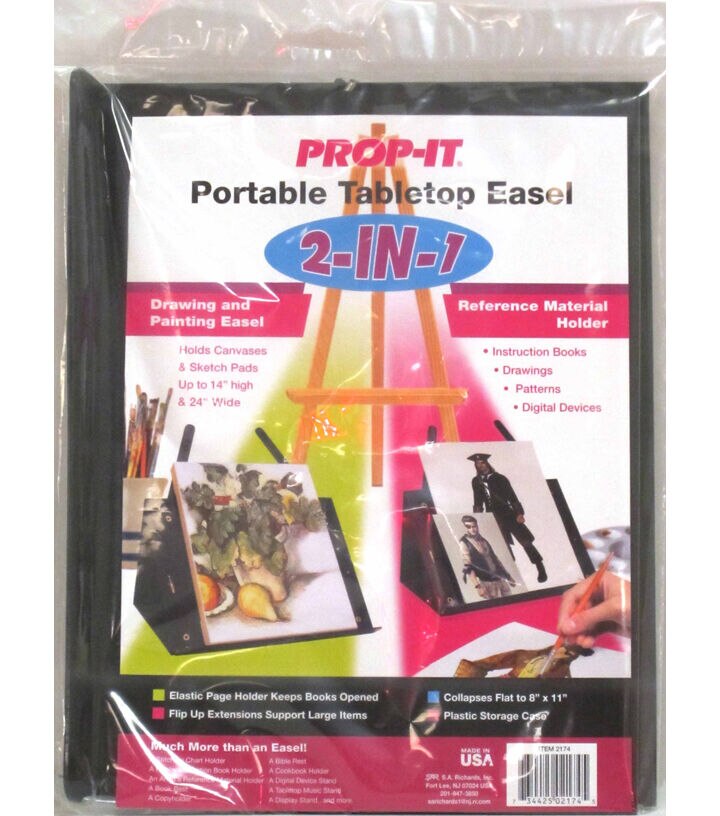 Much more than just an easel! The tabletop painting easel holds canvases up to 14x24 inches. The reference material holder holds instruction books, patterns, photos, and digital devices. The easel contains flip-up extensions that support oversized items. This package contains one 11x6x7 inch 2-in-1 portable tabletop easel. Made in USA.