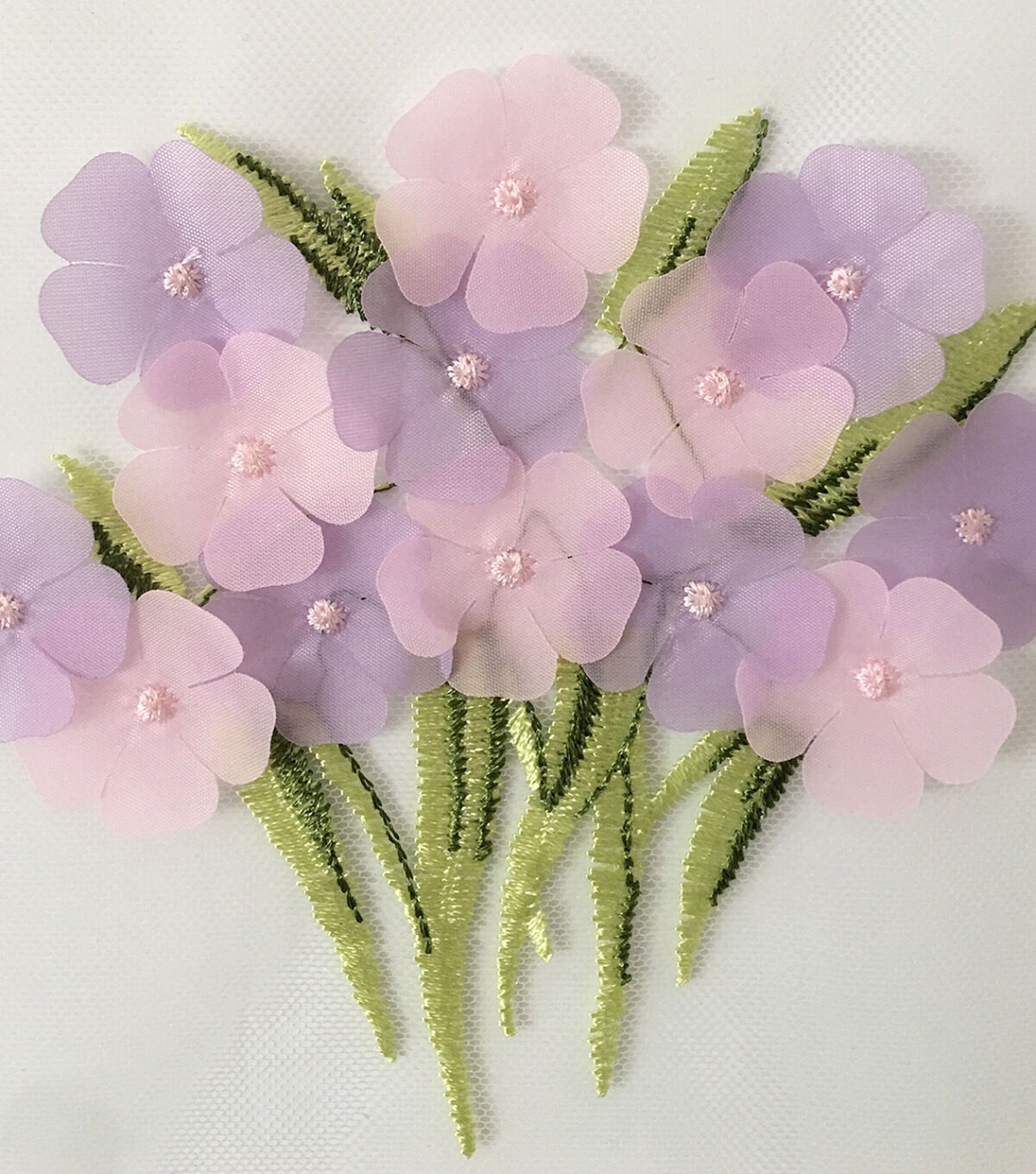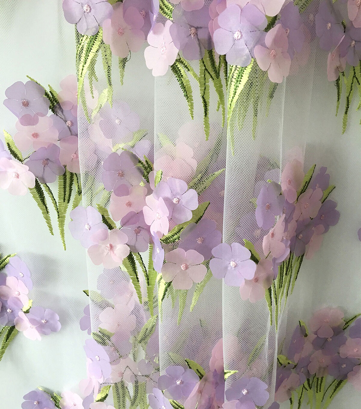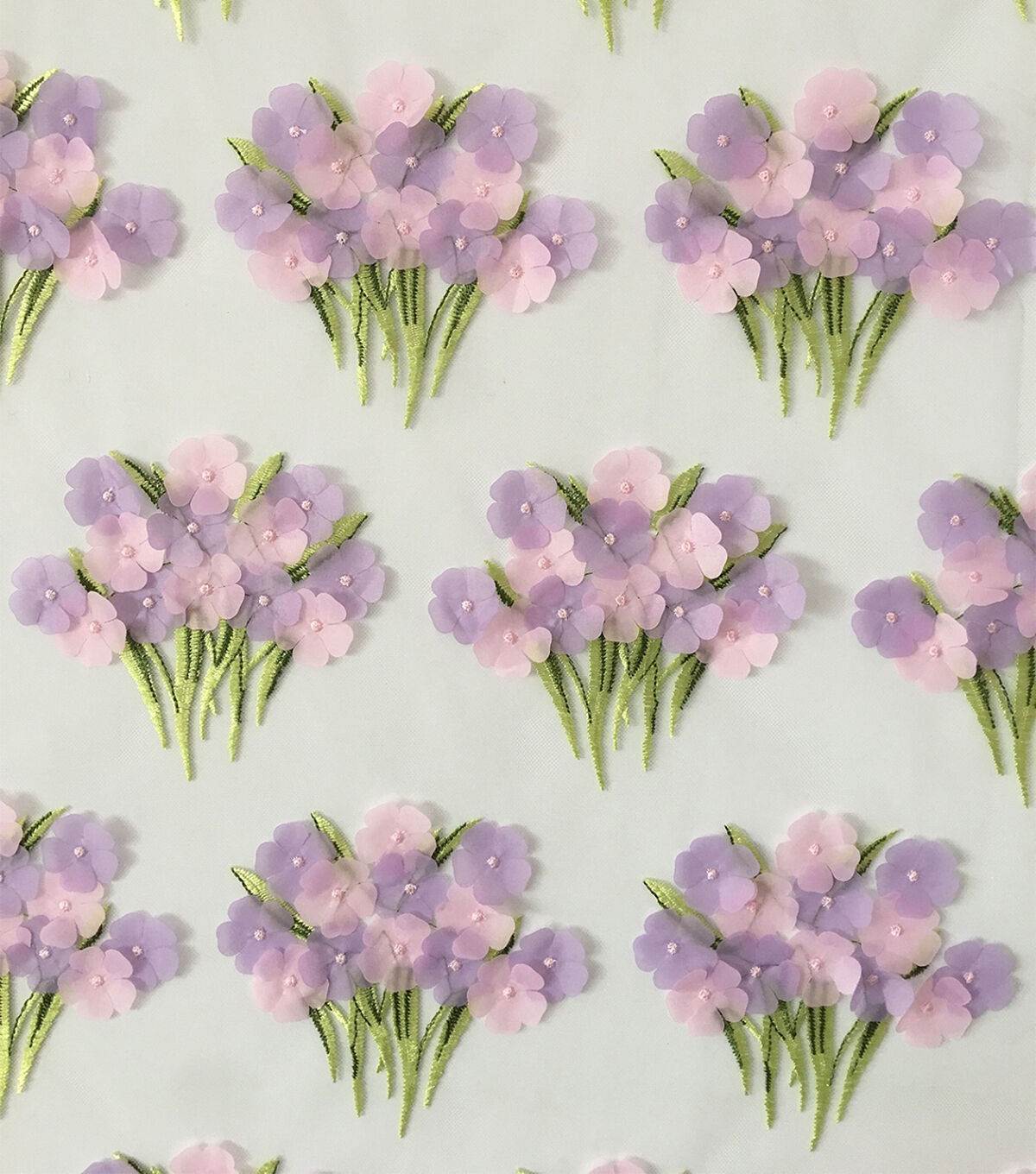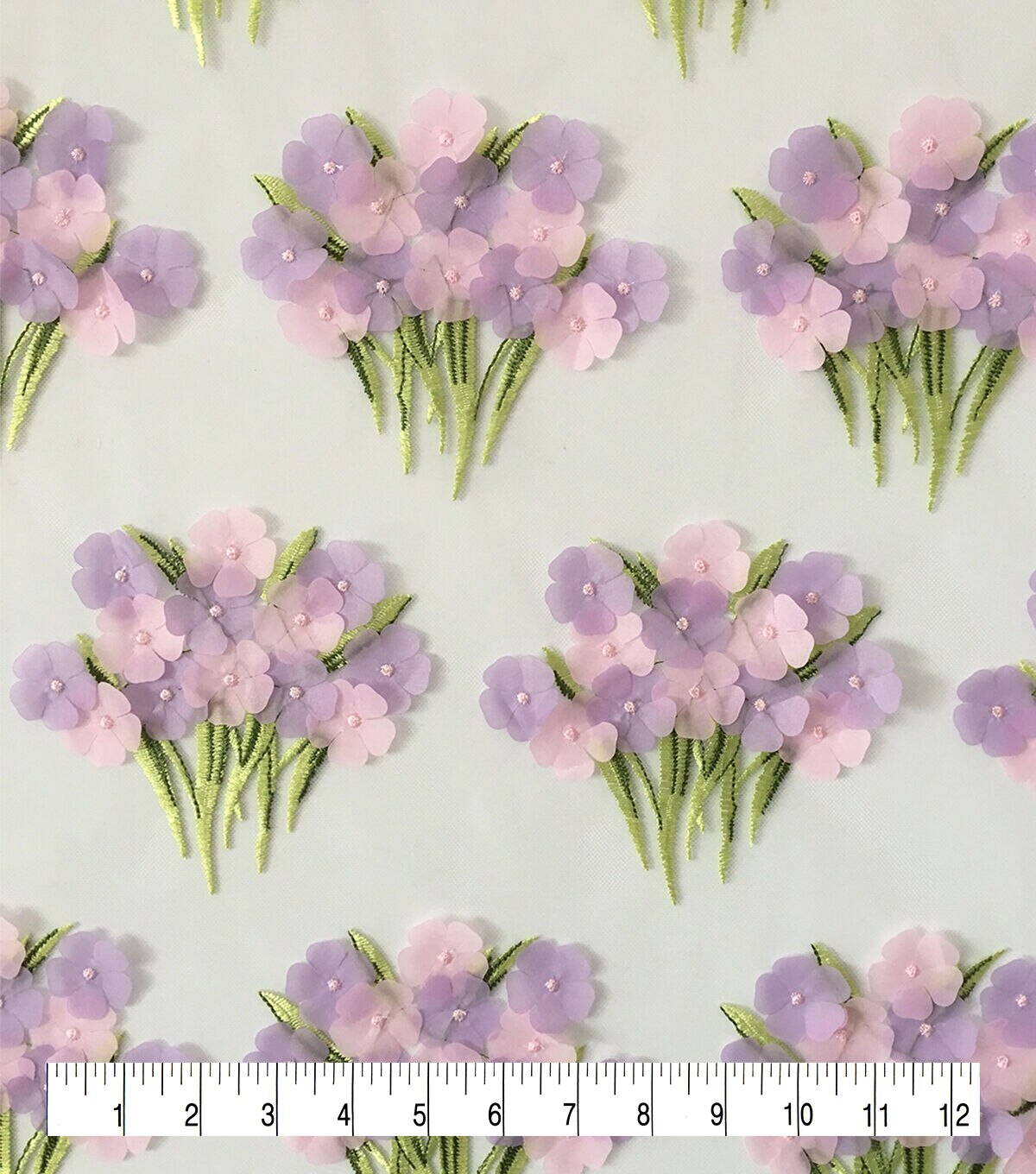 Sew sweet floral and light colors for your wardrobe with pastel purple bouquets on mesh. This polyester fabric is full of cheery spring vibes, plus packs a durability to outlast any occasion. It's also moisture-wicking and breathable for long-lasting comfort as apparel like tops, embellishments and more. So use the pop these 3D flowers add for a style that's uniquely you.