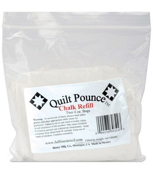 Transferring stencils on quilts is now easy and fun with the Full Line Stencil Quilt Pounce Chalk Powder Refill - White. Simply fill the pad's large inner reservoir with the chalk powder included in the pack and gently wipe it across the surface of the stencil. You can now save hours of marking time with this accurate chalk powder. It offers excellent visibility and stays put when sewing. This chalk powder is practically error-proof, does not pull or stretch fabric and is easier on your hands than holding a pencil.
