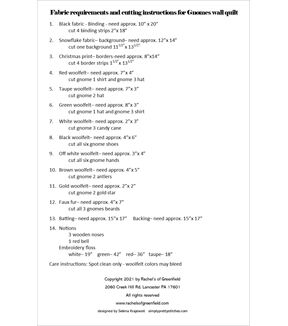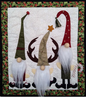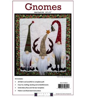 Gnomes are red, green, and tan woolfelt colors on a background of snowflake grey. the border is festive holly with a black binding. From the glistening white faux fur beards and wooden noses to the bright red bell, gold star and fuzzy tassel of the hats, this kit is very unique. This package contains all fabric and woolfelt needed for the entire design, back and binding, batting, embellishments, and instructions. Finished size is 13x15 inches. Made in the USA.