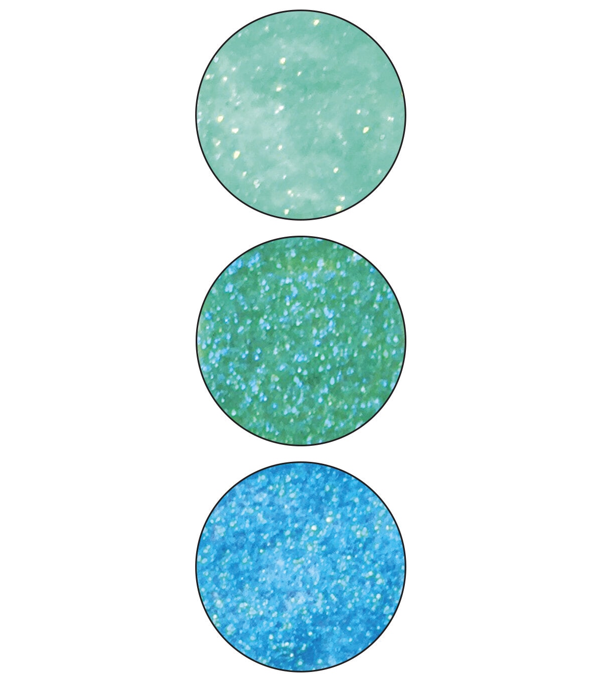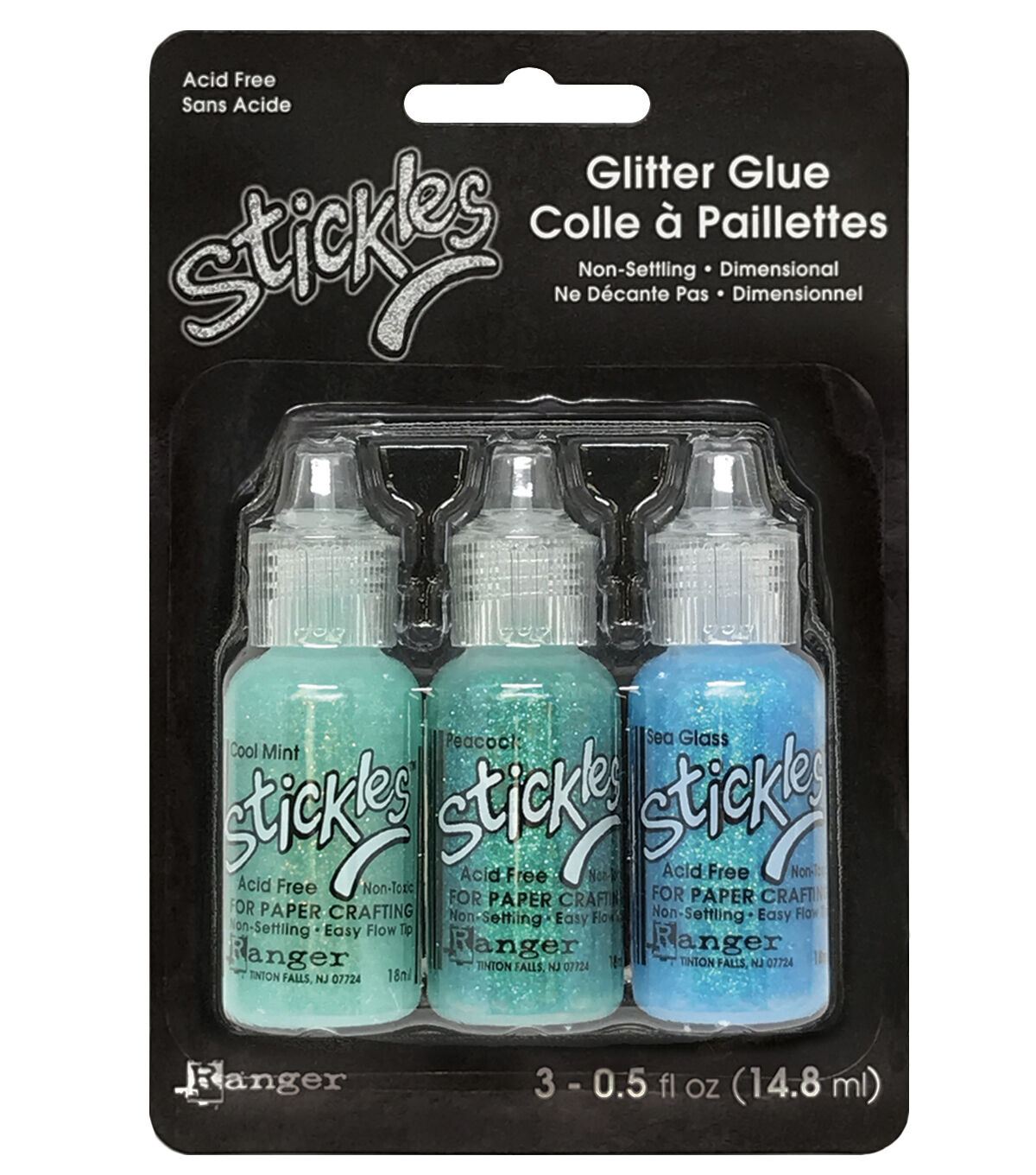Prettify your craft projects with a speck of glitter, using the Ranger Stickles Glitter Glue Pack-Seaside. With fine tip applicators, this glitter glue is easy to apply onto your scrapbook papers, greeting cards, invites, candles, and rubber stamping projects. This kit contains beautiful sea shades like sea glass, cool mint and peacock for visual flair. It includes three, 0.5 fl. oz. bottles with acid-free, non-toxic, non-settling formula glue.