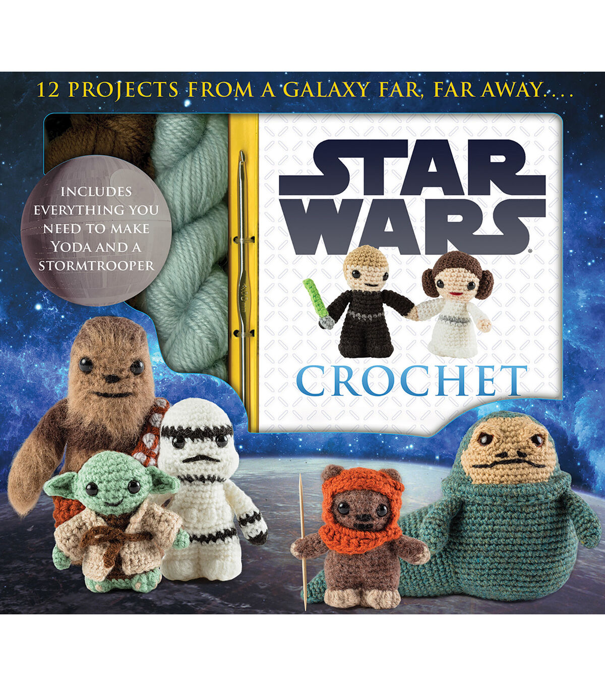 An out-of-this-world crocheting adventure, the Star Wars Crochet kit offers a fun and interactive experience by including a full-color paperback book with step-by-step instructions for crocheting some of the most memorable characters from the original Star Wars trilogy. Also included in the kit are yarn, a crochet hook, a needle, stuffing, and safety eyes, enough to complete two projects, Yoda and R2-D2. The instruction book shows you how to make twelve different characters, so your crochet collection will soon include Luke Skywalker, Darth Vader, Princess Leia, Jabba the Hutt, and many other favorites.