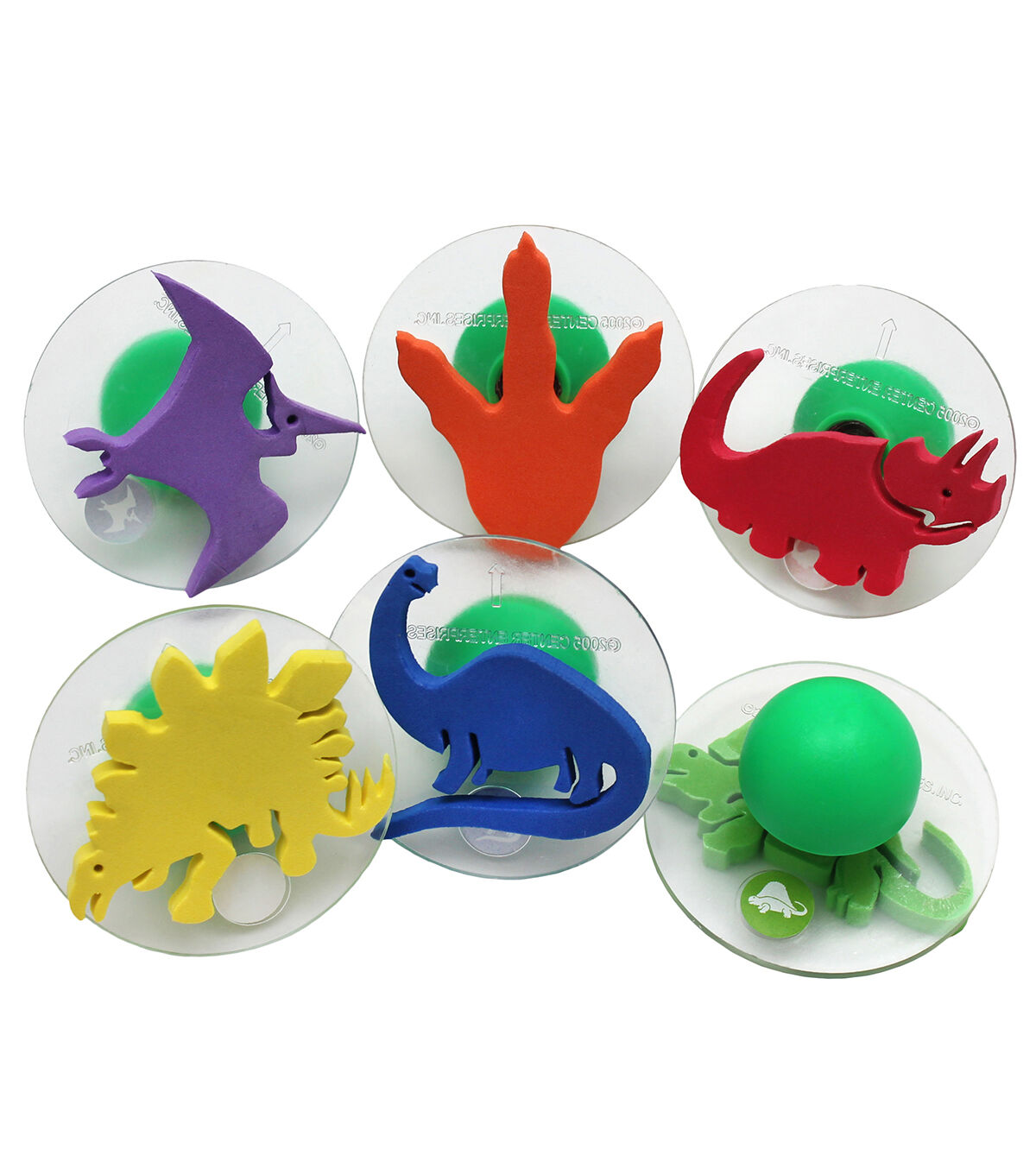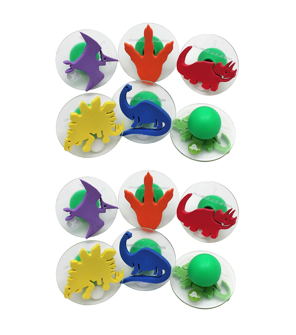 Ideal for use with paint or ink pads, each foam stamp is 3" in diameter and mounted on a clear see-through top for easy, exact placement. Stamps also have a directional arrow for perfect alignment. Stamps and comfort-grip handles are color-coded for easy sorting and storage. Ready2Learn Giant Stampers are a great way to stamp out your own posters, wrapping paper and signs. Includes reusable, clear plastic storage case. Set of 6 includes a Dimetrodon, Brontosaurus, Triceratops, Stegosaurus, Pterodactyl and dinosaur foot print. Includes 6 stamps set each, 2 sets, 12 stamps total.