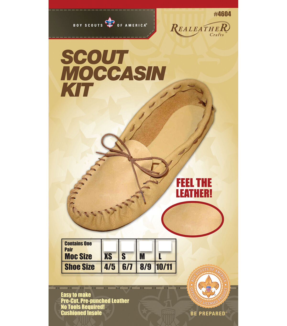 The Realeather Large Scout Moccasin Leathercraft Kit is easy to complete. This kit includes pre-cut, pre-punched suede leather parts, foam insoles, lace and complete instructions. Ladies order shoe size and men order one size larger. These moccasins are comfortable and durable.