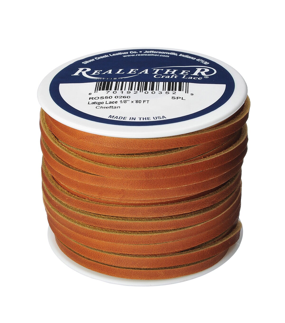 For that rustic, strong, earthy look, latigo is your best choice. This full grain, 5 to 7 oz. leather lace is the most durable continuous leather lace available. Our 1/8" Latigo Lace is commonly used for sporting goods, footwear, outdoor gear, saddlery and animal gear, and heavy-duty projects that require a little extra strength while providing a stylish and finished look.