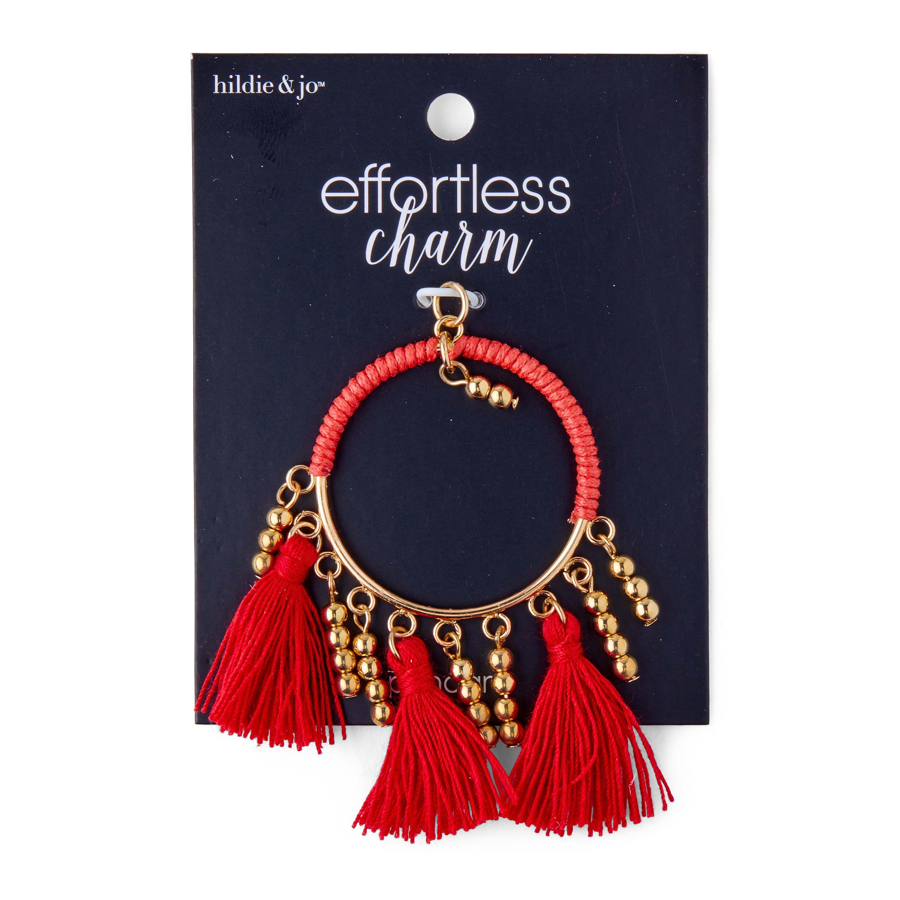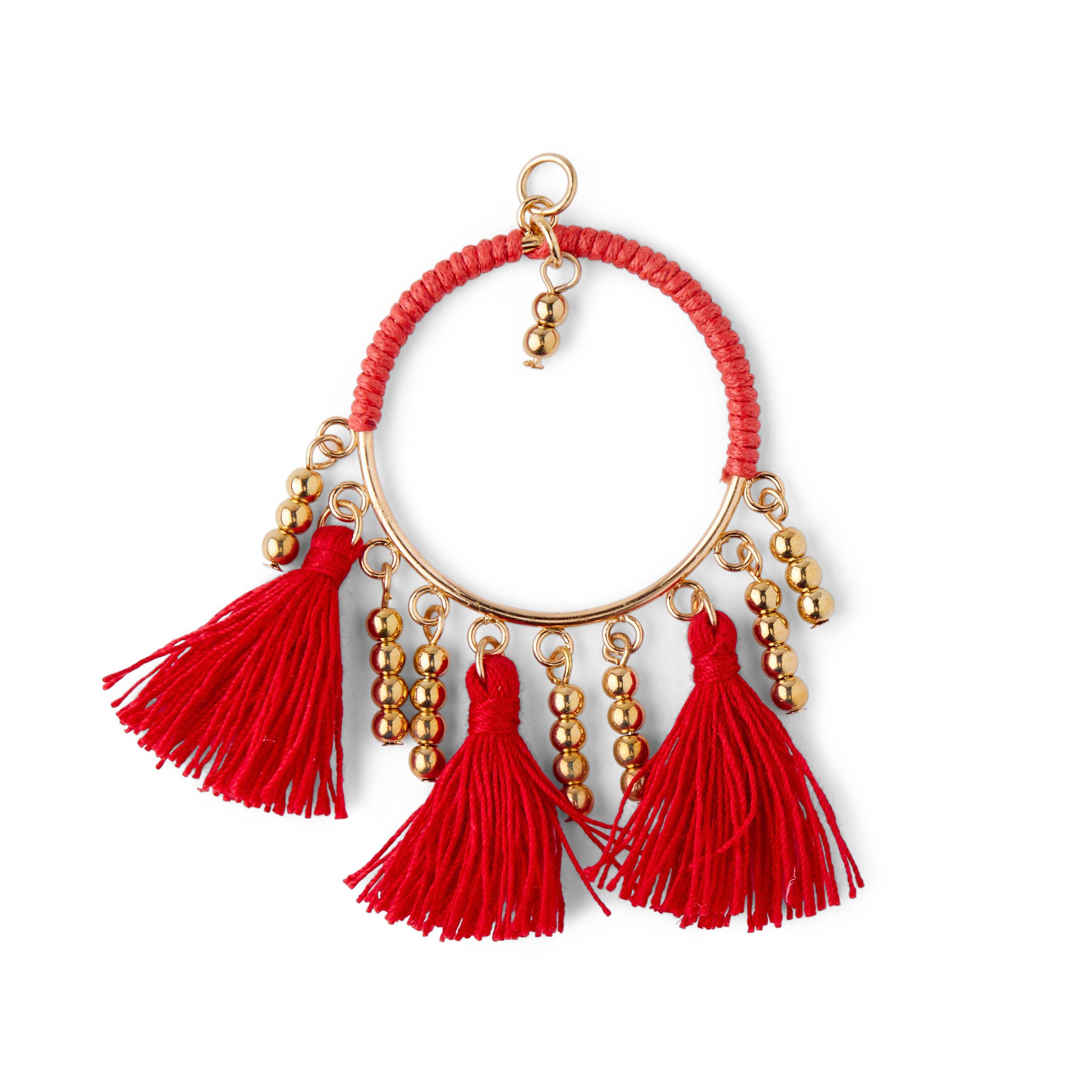 Vibrant and trendy, the hildie & jo Effortless Charm Zinc Alloy, Iron & Polyester Tassel-Red perks up the look of any necklace, bracelet, key ring, or other accessory. This red tassel charm is accented with small gold beads for added visual interest.