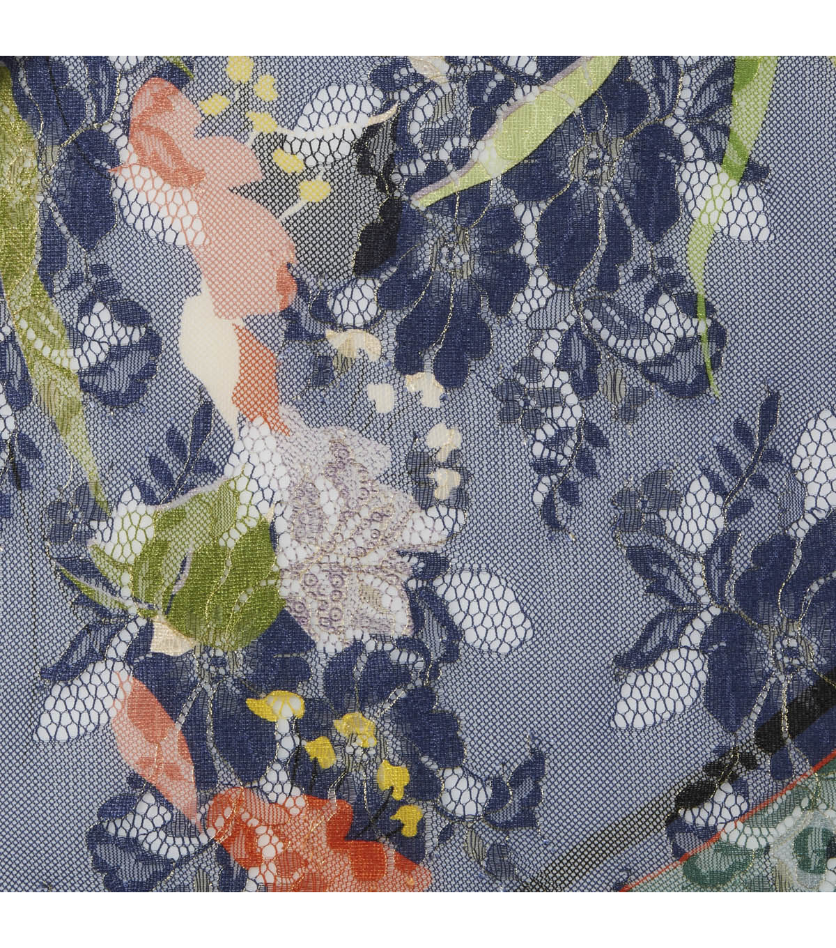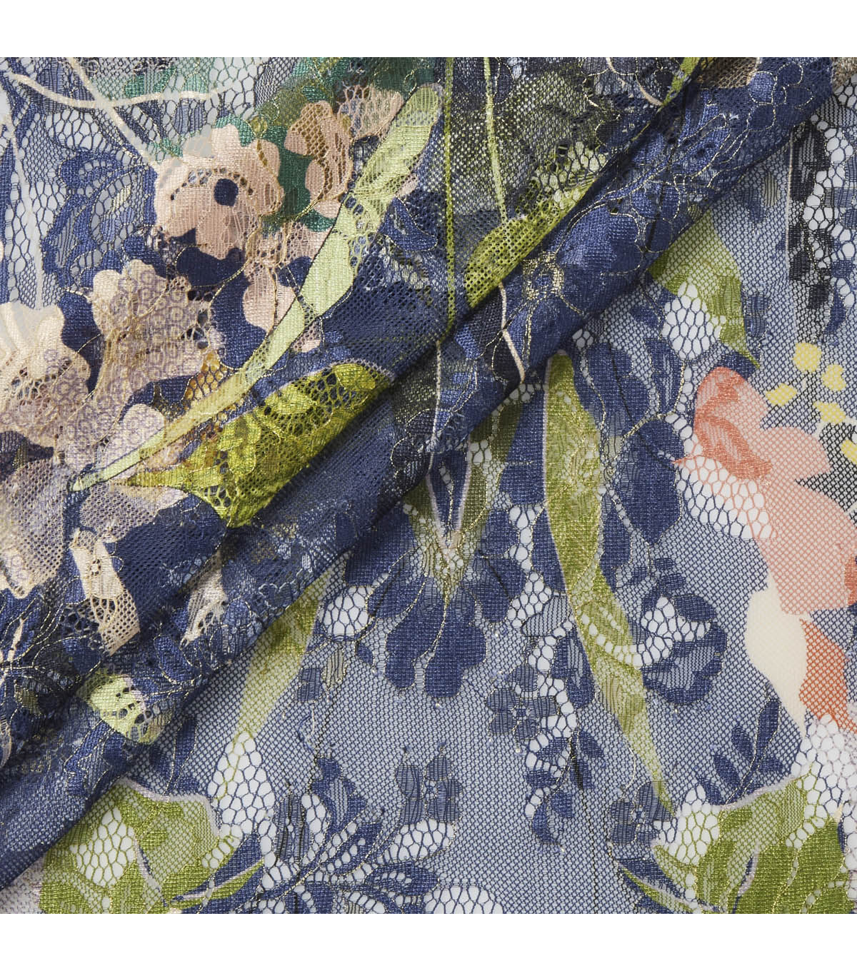 Our dazzling new designer mesh will help knock your apparel out of the park. The color combination of floral blues and greens with peach gold is an elegant pop of design for tops and formalwear. This fabric is super breathable, durable, and good for beginner sewers to up their game; giving you total freedom to just be that fashionable you.