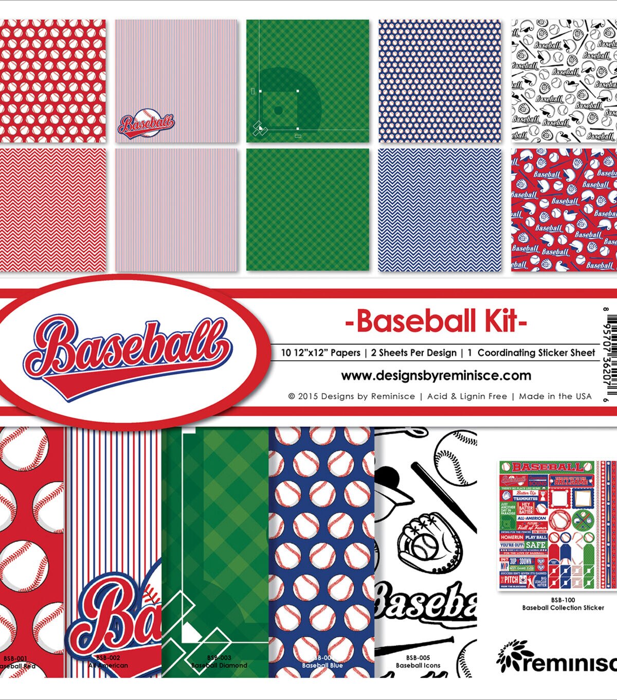 Reminisce-Baseball Collection Kit. The perfect start to all your paper crafting projects! This package contains ten 12x12 inch double-sided sheets in five different designs (two of each) and one 12x12 inch sticker sheet. Acid and lignin free. Made in USA.