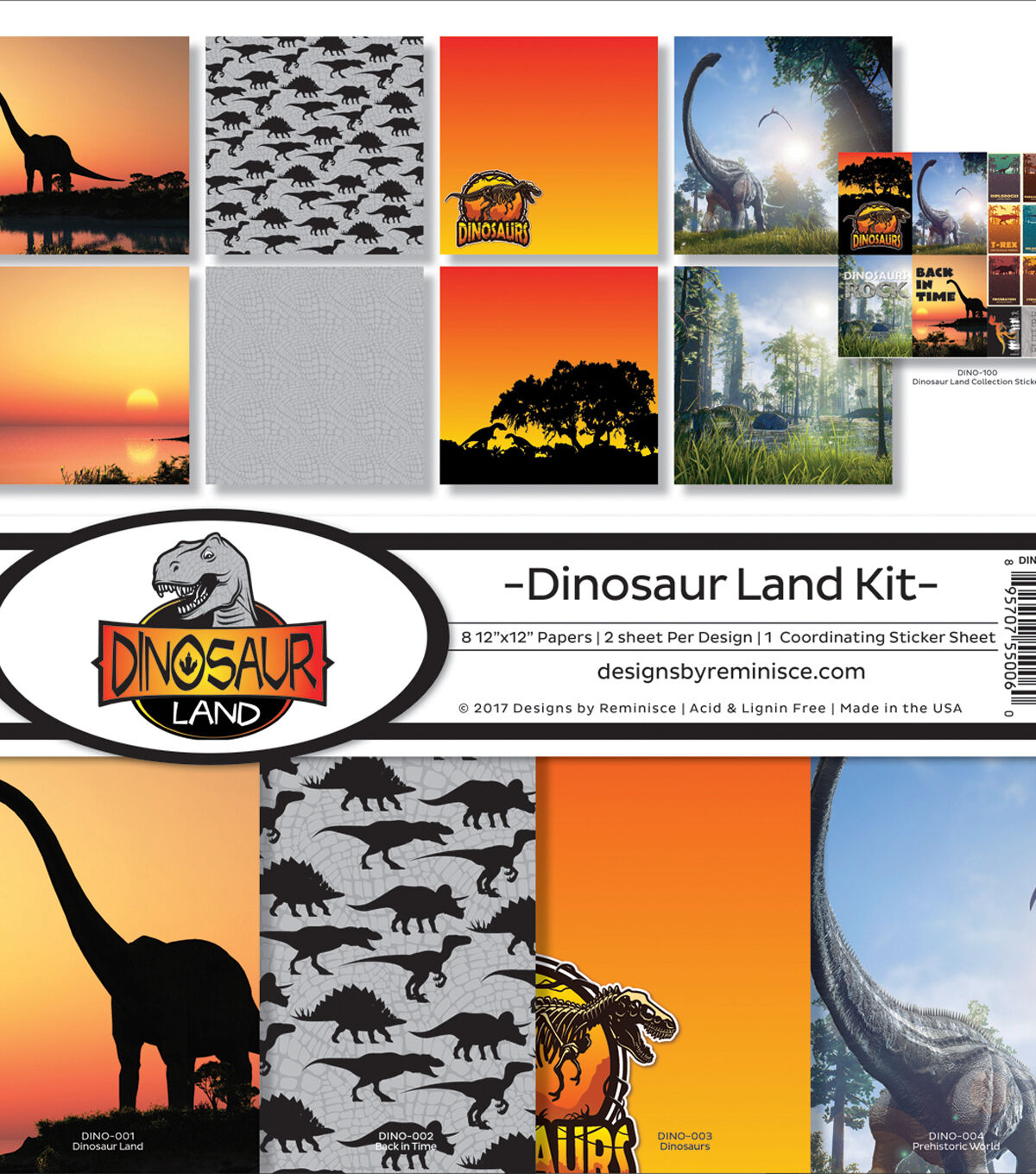 Reminisce-Collection Kit: Dinosaur Land. The perfect start to your next paper crafting project! This 12.5x13.5 inch package contains eight 12x12 inch sheets of paper, two of each design, and one sheet of coordinating stickers. Acid and lignin free. Made in the USA.