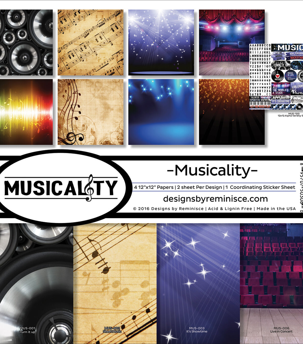 Reminisce-Musicality Collections Kit. The perfect start to your scrapbooks, cards and more! This package contains eight 12x12 inch double-sided sheets in four different designs (two of each) and one 12x12 inch sticker sheet. Acid and lignin free. Made in USA.