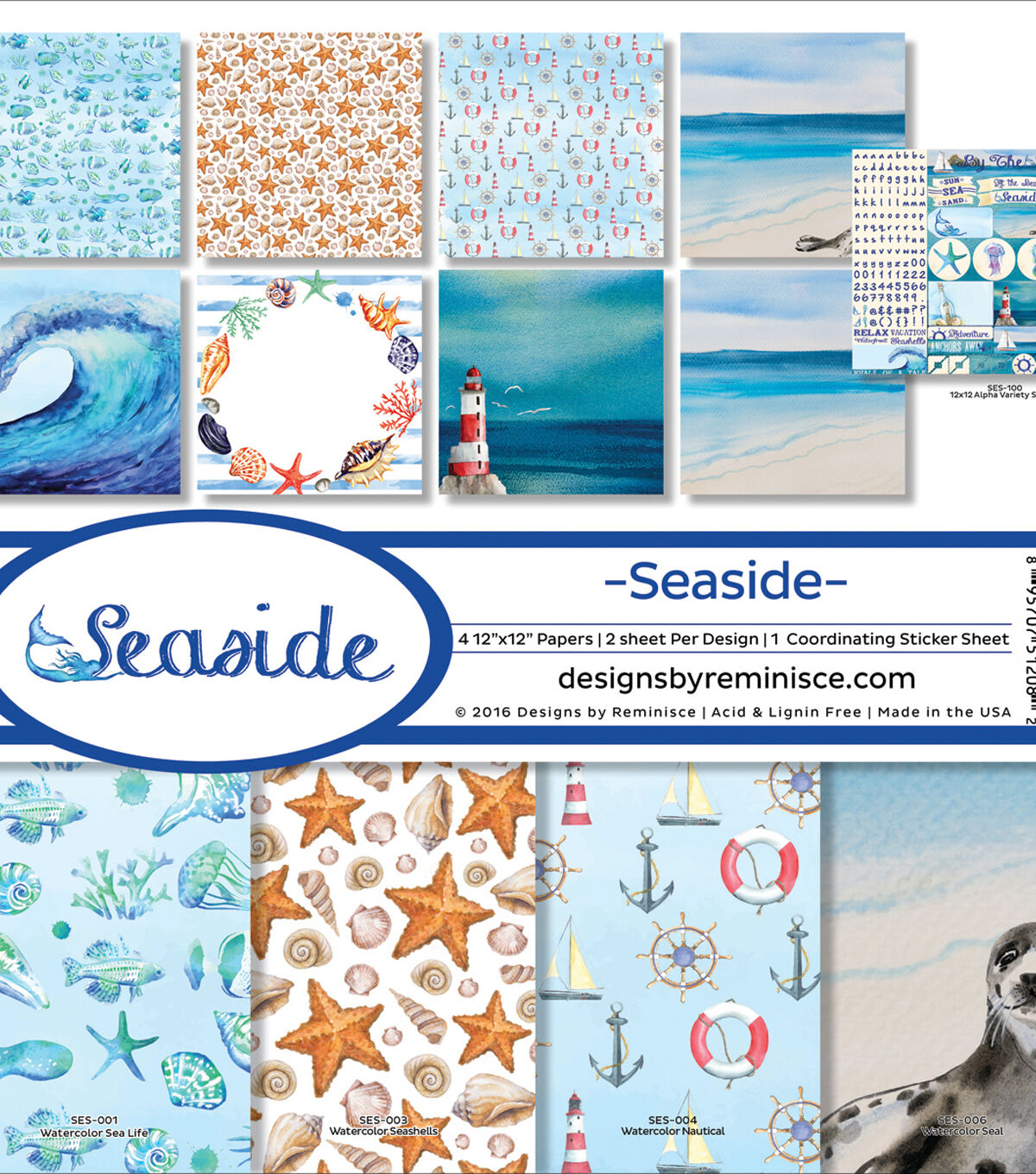 Reminisce-Seaside Collections Kit. The perfect start to your scrapbooks, cards and more! This package contains eight 12x12 inch double-sided sheets in four different designs (two of each) and one 12x12 inch sticker sheet. Acid and lignin free. Made in USA.