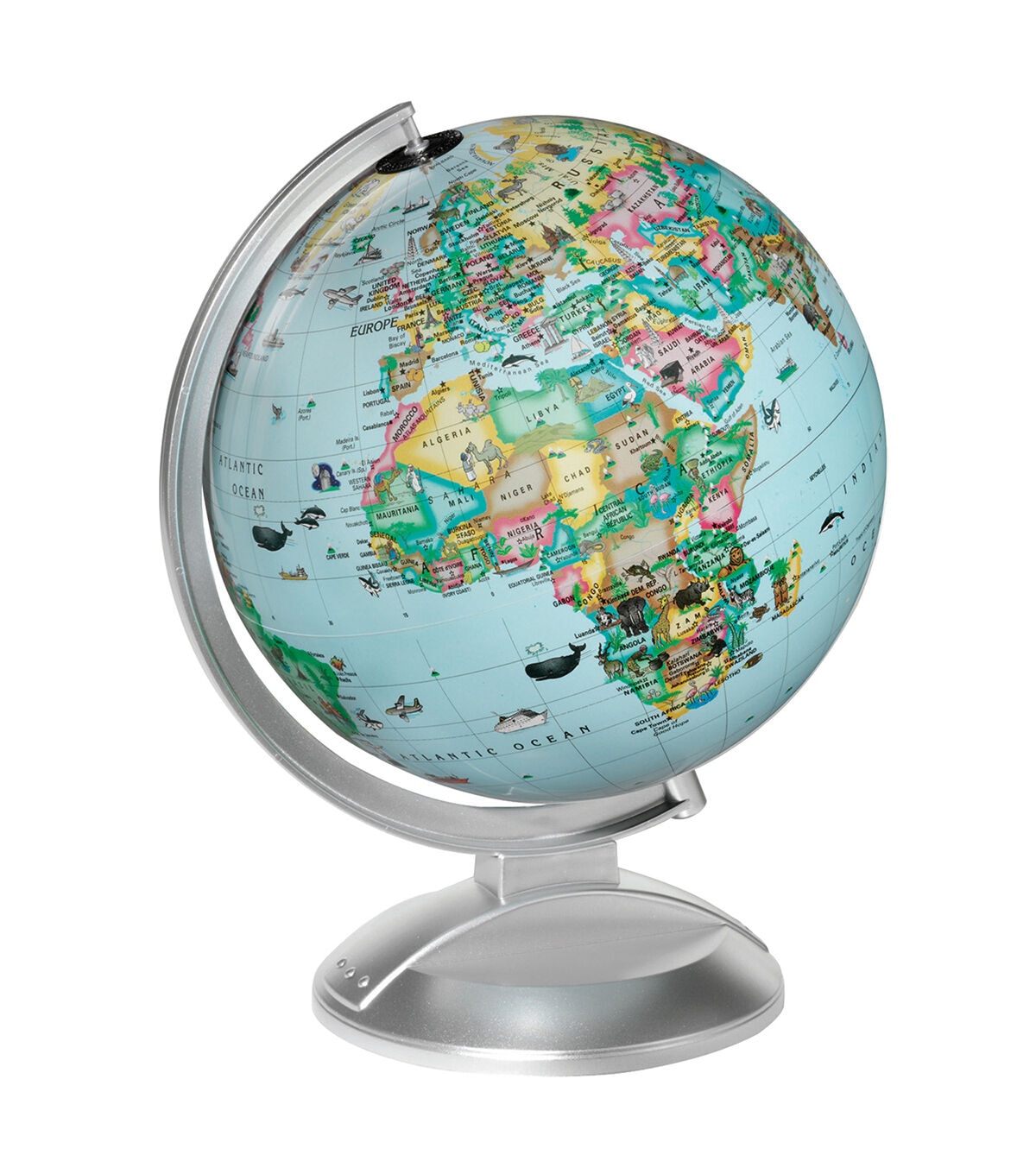 Explore more than 125 drawings of people, landmarks and animals on this kid friendly political map. Turn the light on to see physical map showing hidden aquatic animals such as lantern fish and ship wrecks such as Titanic. The illuminated globe also shows areas of tectonic plates of the Earth. Find the Pacific Ring of Fire? showing earthquakes, volcanic activity, mountain-building, and oceanic trench formation. This globe will become a perfect companion to any child's imagination. Measures 13.5"H x 11"W x 10"D.