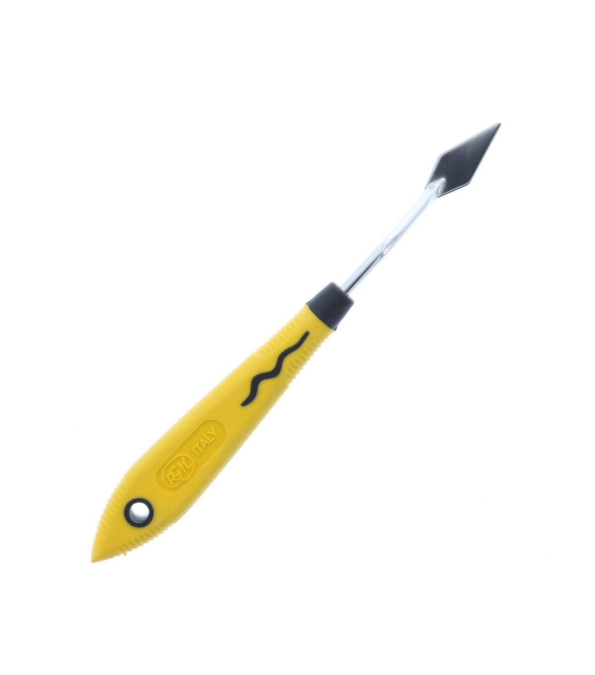 This palette knife features a high-quality steel blade and a rubber handle designed to prevent fatigue. Handcrafted in Italy, this palette knife blade has been specially treated to ensure excellent flexibility as well as a longer lifespan. This is an essential tool for mixing colors and applying paint; enjoy the consistency of your colors and explore a world of possibility regarding texture and pattern.
