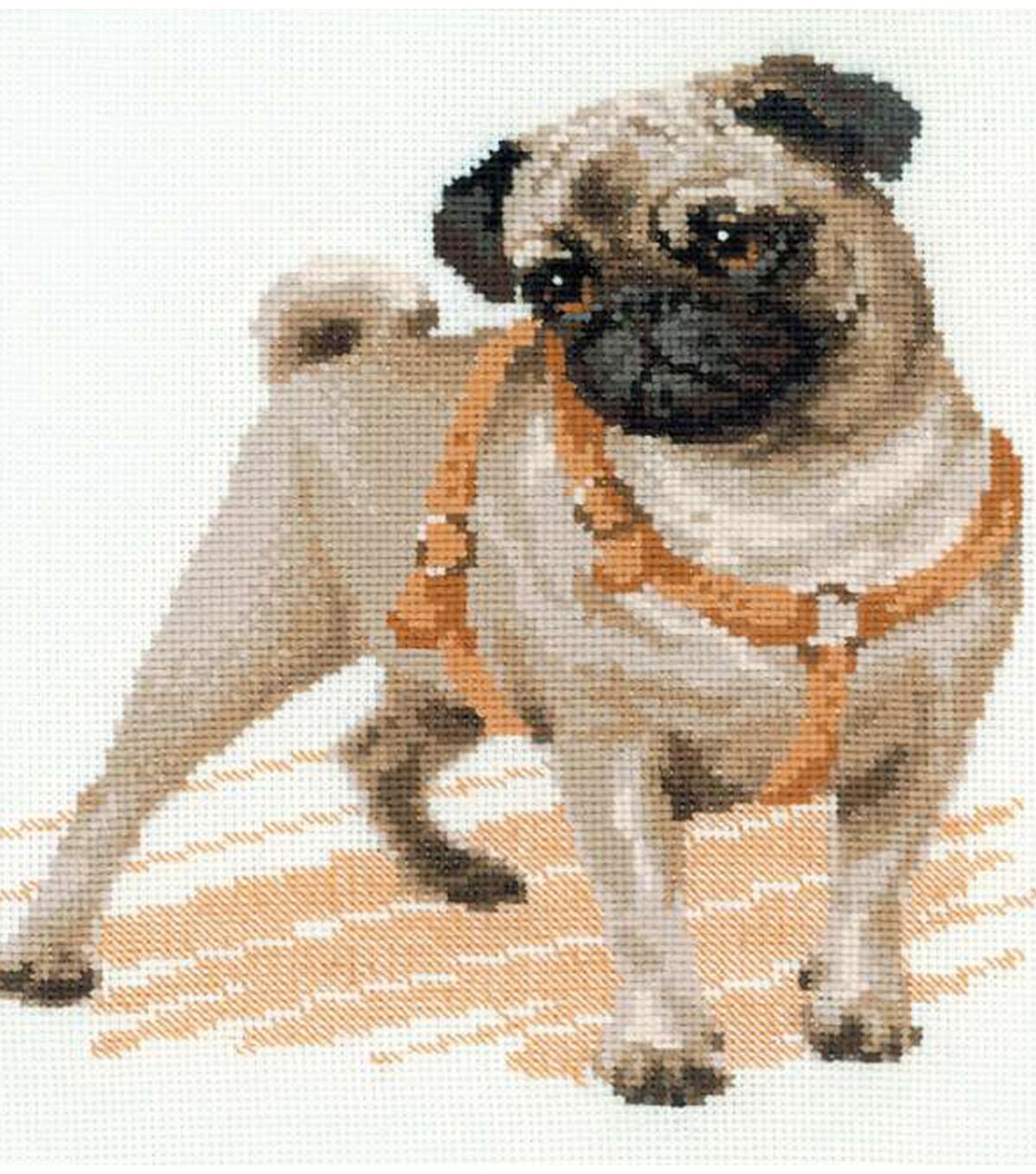 RIOLIS-Counted Cross Stitch Kit. Express your love for arts and crafts with these beautiful cross stitch kits! Find a themed kit for any taste! This package contains 14 count white Zweigart Aida fabric, Safil wool/acrylic yarn in fourteen colors, one needle, color chart and instructions. Design: Pug Dog. Finished Size: 9.75x9.75 inches. Imported.