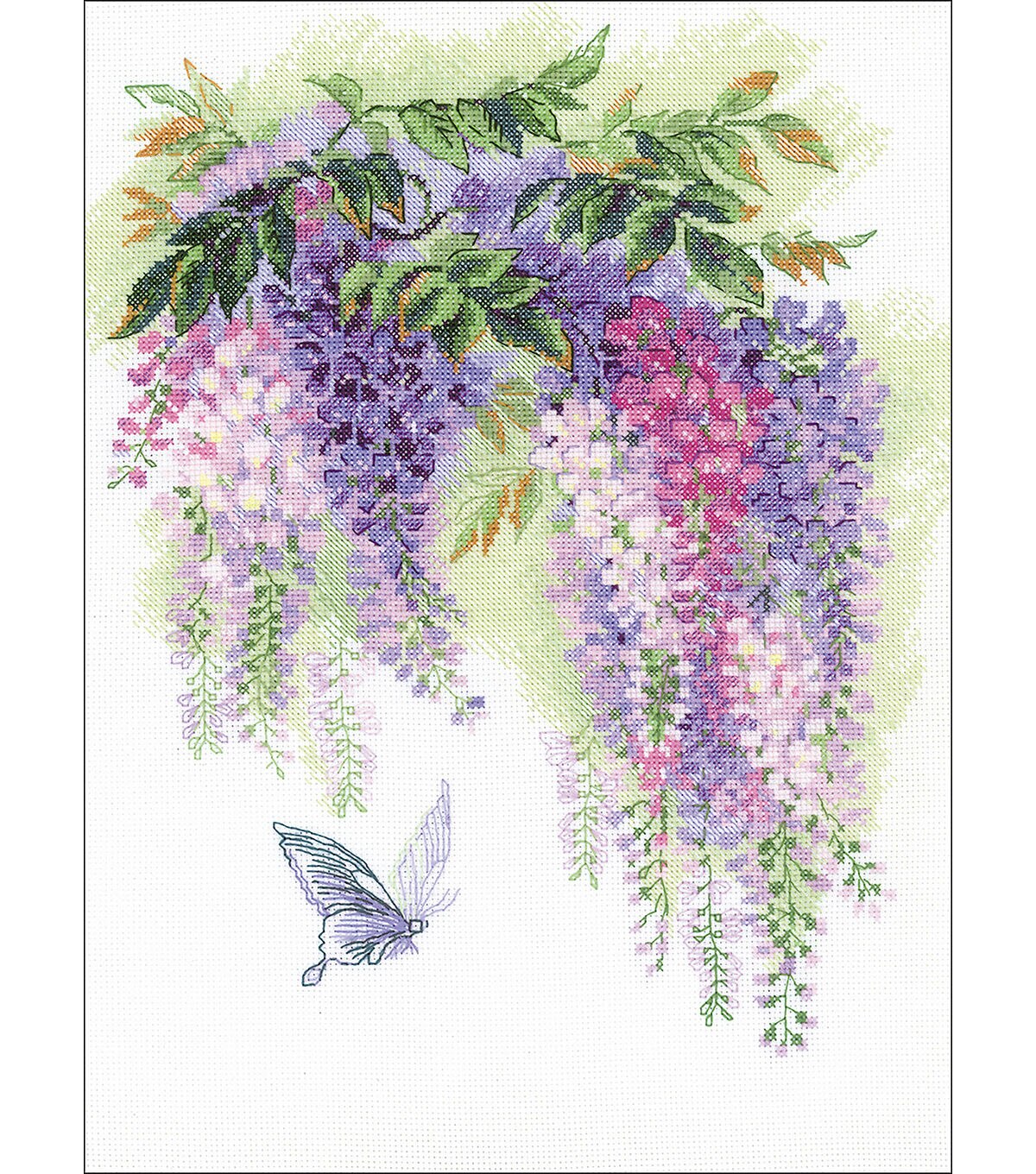 Express your love for arts and crafts with these beautiful cross stitch kits! Find a themed kit for any taste! This package contains 14 count Zweigart Aida fabric, Safil wool/acrylic thread in 19 colors, one color chart and one needle. Design: Wisteria. Finished size: 11.75x15.75 inches. Imported.